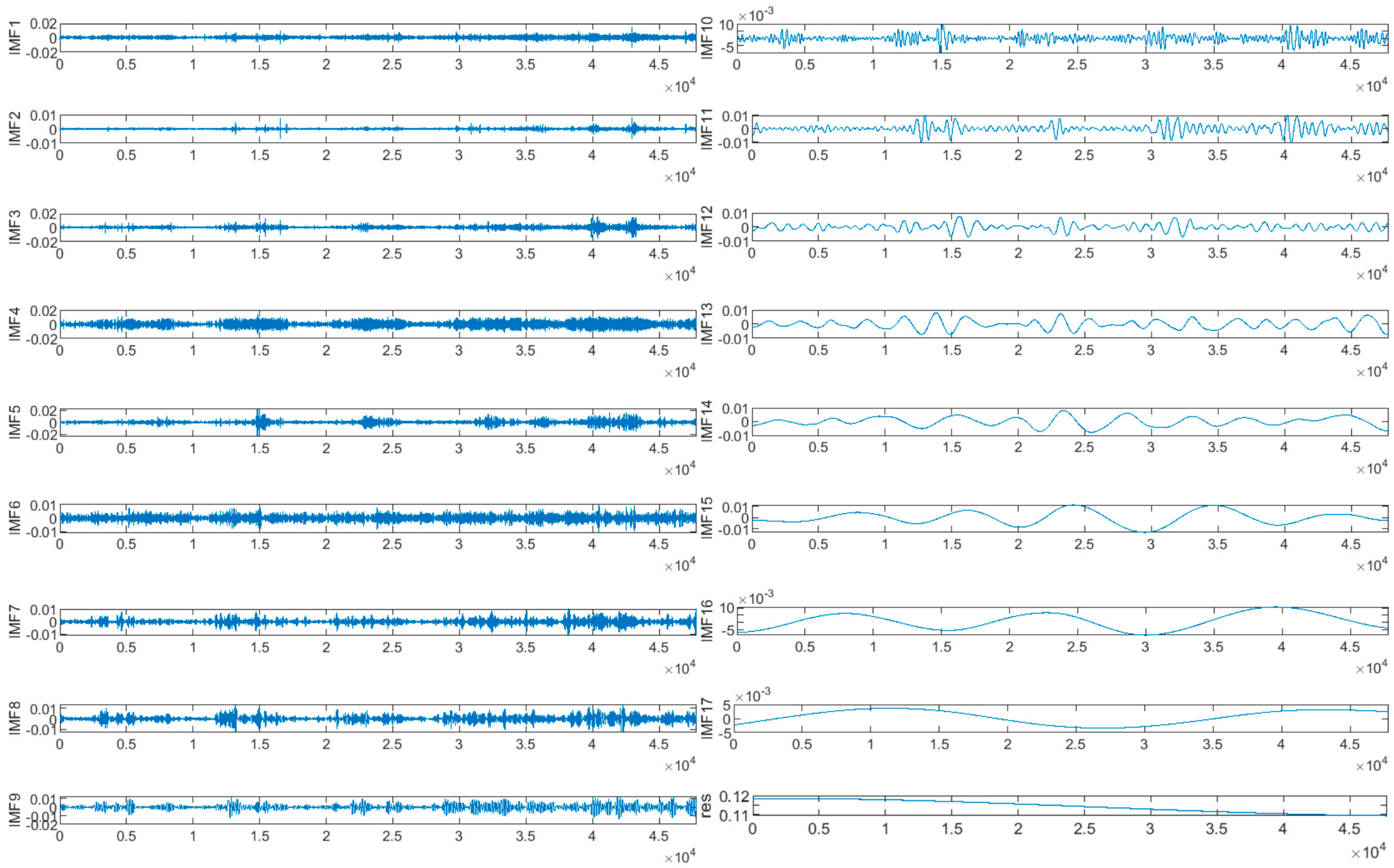 Step 3: Extract residual modes: Residual components are calculated, and the process is repeated using the first-order modal component in place of the original data. This iterative procedure continues until no significant IMF signals remain in the residual. Ultimately, the original signal is fully decomposed into its IMFs.