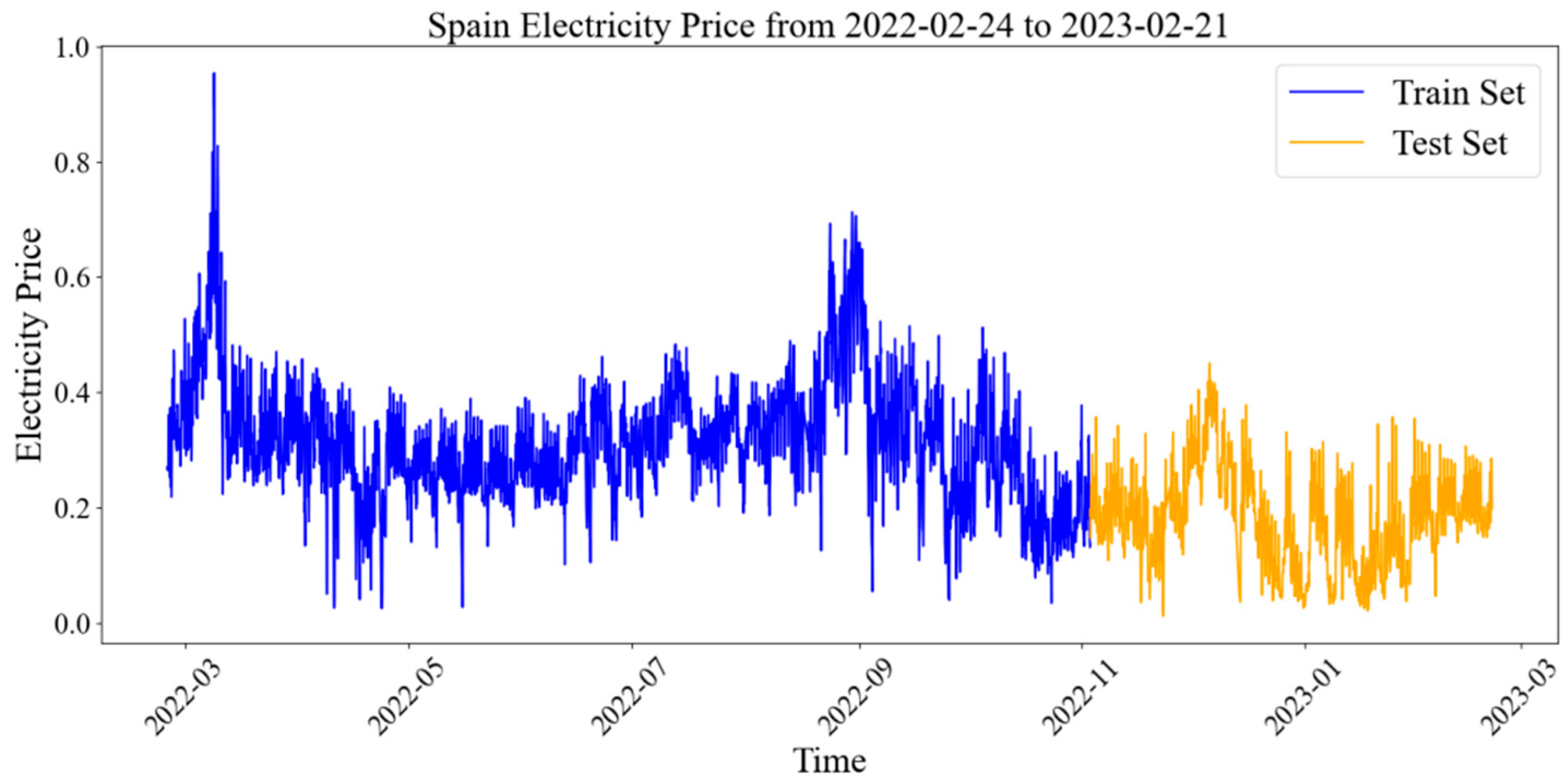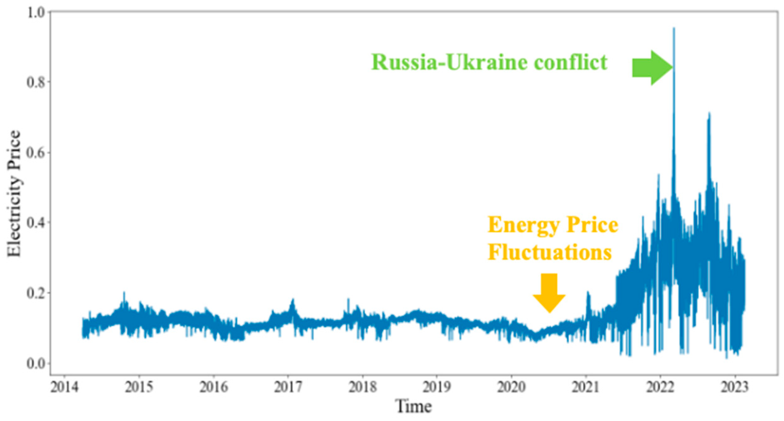 2]. Furthermore, structural challenges such as transmission bottlenecks, real-time supply–demand imbalances, and the growing share of renewable energy sources can trigger brief but sharp price spikes. These complex dynamics increase the complexity of forecasting models and heighten the risk of prediction errors, which can significantly affect power plant operators, market decision-makers, and participants [