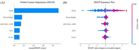 Figure 2A reports the mean absolute SHAP values () for the four RIS latent dimensions, quantifying their relative contributions to patent output prediction. The Firm dimension exhibits the highest (0.913), followed by Knowledge (0.162), province_code (0.141), Gov (0.114), and Econ (0.108). This indicates that enterprise-level innovation is the primary driver of regional patent outputs, while Knowledge and Gov primarily act as modulators whose contributions vary across provinces. In contrast, Econ exerts minor but threshold-like effects, providing background support once Firm and Knowledge effects are accounted for.