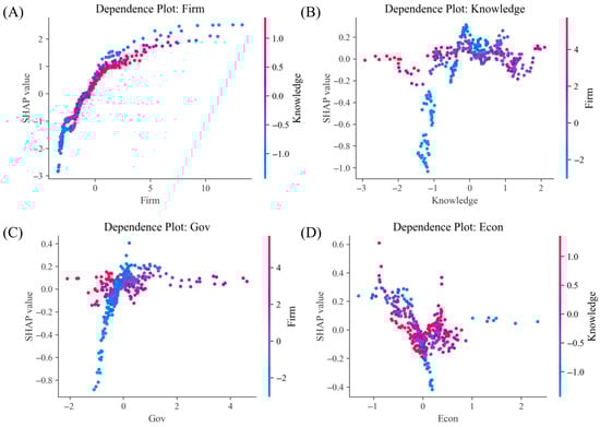 Nonlinear marginal effects and interaction mechanisms among RIS latent variables. (A) Firm SHAP dependence plot with Knowledge interaction; (B) Knowledge SHAP dependence plot with Firm interaction; (C) Gov SHAP dependence plot with Firm interaction; (D) Econ SHAP dependence plot with Knowledge interaction.