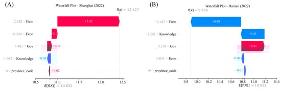 Figure 4. SHAP waterfall analysis of regional mechanisms: Shanghai vs. Hainan. (A) Shanghai (2022) SHAP waterfall plot; (B) Hainan (2022) SHAP waterfall plot. - Hainan: Figure 4B reveals a contrasting pattern for Hainan. Both Firm and Knowledge contribute negatively, indicating insufficient endogenous capacity and limited knowledge support. Gov contributes positively, highlighting the compensatory role of policy in a low-innovation context. Nevertheless, overall output remains constrained, demonstrating that government intervention alone cannot fully offset structural weaknesses in endogenous innovation.