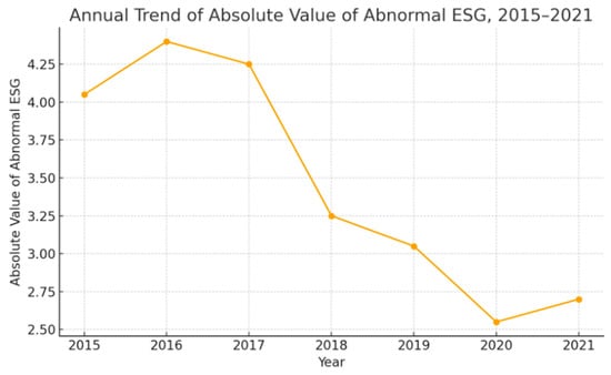 While the literature extensively examines factors influencing firm ESG performance, research exploring the drivers of deviant ESG behavior remains limited. Abnormal ESG performance, which refers to ESG practices that deviate from expected targets, is expected to significantly influence firm competitiveness and overall ESG effectiveness [6]. The abnormal ESG value of listed firms in the Chinese market has changed over the past few years, as shown in Figure 1. Firms that outperform (exceeding expectations) demonstrate a commitment to sustainability, potentially driving substantial value creation. Conversely, firms that underperform (failing to meet expectations) face potential risks and lost opportunities. Several factors affect firms’ engagement in abnormal ESG activities [1,8]. Existing literature shows internal firm factors, such as increased cash flow, which may incentivize firms to engage in excessive ESG activities, and external factors, such as increased shareholder pressure, lead to ESG performance significantly deviating from industry norms [9,10]. However, existing research has not adequately linked the ESG rating divergence with abnormal ESG performance. We aim to determine the impact of ESG controversies on abnormal ESG performance and elucidate the underlying mechanisms.