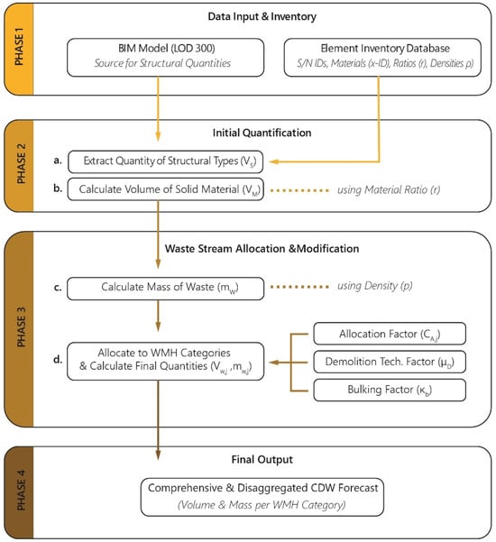 The initial volumes of these structural types (Vs) are directly extracted from a BIM model developed to Level of Development (LOD) 300 according to the specification of the BIMforum [15]. While the model is capable of processing data in various units (m3, m2, m), all quantities are subsequently normalized to volumetric units (m3) to ensure consistency. The volume of each solid material component (VM) is then calculated by multiplying the total structural volume (Vs) with the corresponding material ratio (r). Following this, the mass of each waste component (mw) is determined by applying the appropriate material density (ρ), sourced from an internal database comprising 13 distinct waste types (W01–W13). The final stage of the framework involves classifying these quantified material flows into eight waste management categories, in accordance with the principles of the EU waste hierarchy [21] (i.e., reuse, recycling, energy recovery, and disposal). This classification is governed by a set of material-specific allocation factors (CA,j), derived from a reference scenario. To account for real-world conditions, the model integrates two critical modifying parameters: the demolition correction factor (μD), which quantifies the impact of the selected demolition method (e.g., manual vs. mechanical) on material integrity, and the bulking factor (kb), which adjusts for the volumetric expansion of materials during the transition from solid to loose state. The output of the framework is a comprehensive and detailed prediction of CDW, specifying the volume and mass of individual material flows, as well as their distribution across the defined waste management categories. This systematic approach provides a robust foundation for the sustainable planning and execution of deconstruction projects involving historic buildings.