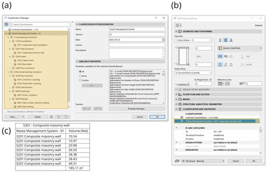 For the development of the method, Archicad 27 was used, which enables the import and application of custom classification systems. The hierarchical classification system presented in Chapter 3.1 was imported into the software in XML format (Figure 4a), and during the modeling process, each element was assigned to the appropriate class (Figure 4b). In addition, an attribute was created that, based on the assigned class, generates a precise identifier for each element by concatenating the identifiers of the higher-level categories. This identifier is also included in the quantity take-off (Figure 4c), thereby facilitating the identification and categorization of elements within the waste management hierarchy (see Section 3.3).