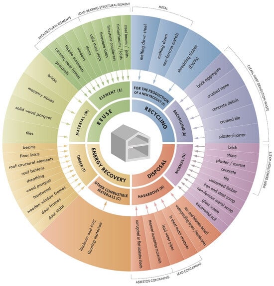 The applicability of waste management categories was examined for CDW generated from the deconstruction of multi-story urban residential buildings constructed in the late 19th and early 20th centuries. The analysis was conducted not only at the material level but also at the building element level, with particular attention given to typology-specific components characteristic of this building stock (e.g., limestone cantilevers and slabs of side corridors, steel beams of Prussian vault floors, etc.). For each structural element, all applicable waste management categories were identified, depending on the post-demolition condition of the element. A waste management hierarchy comprising four main categories—reuse, recycling, energy recovery, and disposal—was adopted, with each category further subdivided into two subcategories (Figure 6).