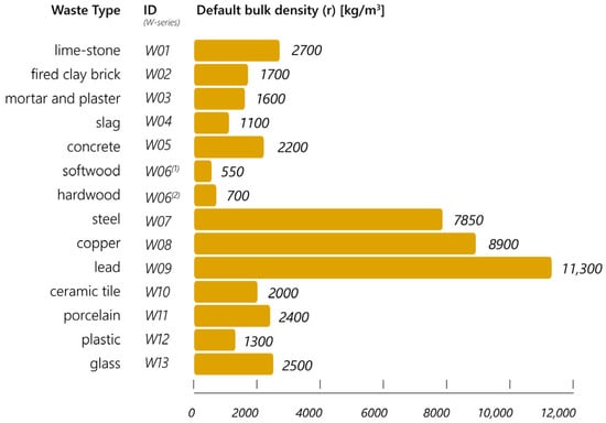 For wood waste (W06), bulk density is known to vary widely—from 350 to 1080 kg/m3—depending on wood species, moisture content, and material quality. Based on the characteristic use of timber in the examined building typology, two subcategories were distinguished: