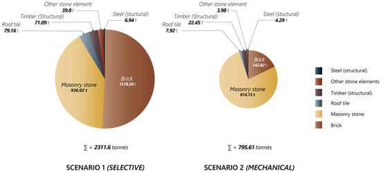 Considering the mixed use of materials typical of the analyzed building type—both during initial construction and subsequent repairs—a uniform density value of 1600 kg/m3 was defined for the calculations. The density values for the remaining waste types were determined in an analogous manner, based on an assessment of historical construction techniques and the materials typically used during the relevant period.
