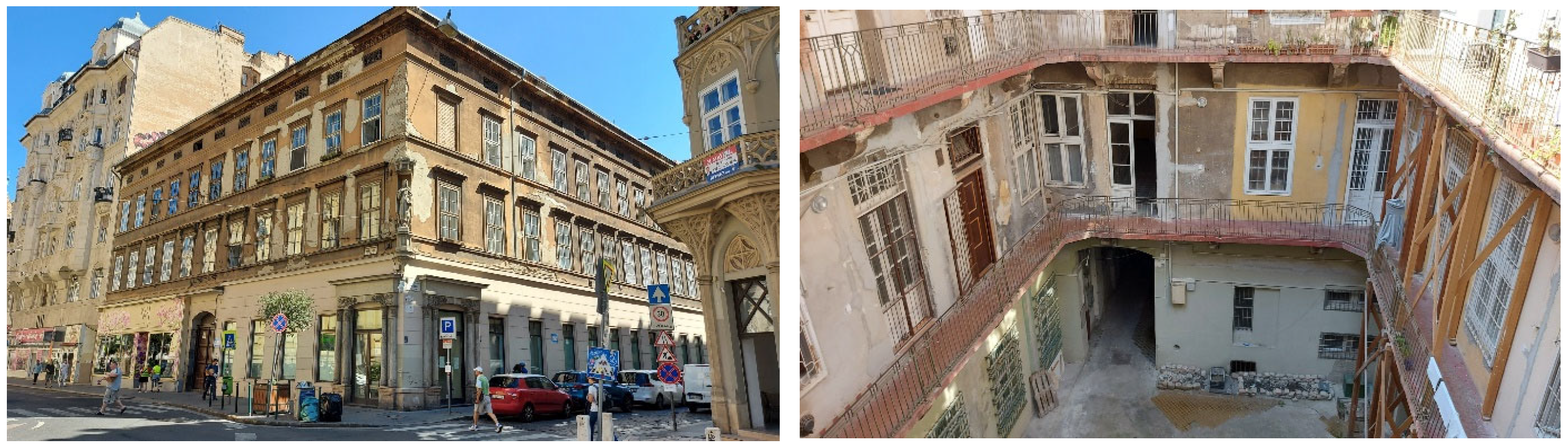 The tenement houses of Pest constructed in the late 19th and early 20th centuries, following the Austro-Hungarian Compromise [8], represent characteristic and outstanding examples of European architecture from the period. Originally constructed as multi-story, closed-row buildings with internal courtyards, they embody the urban lifestyle and social structure of their era. Their distinctive spatial organization and high-quality materials—including brick walls, Prussian vaults, and timber joist floor—continue to distinguish these buildings within Budapest’s architectural heritage (Figure 1).