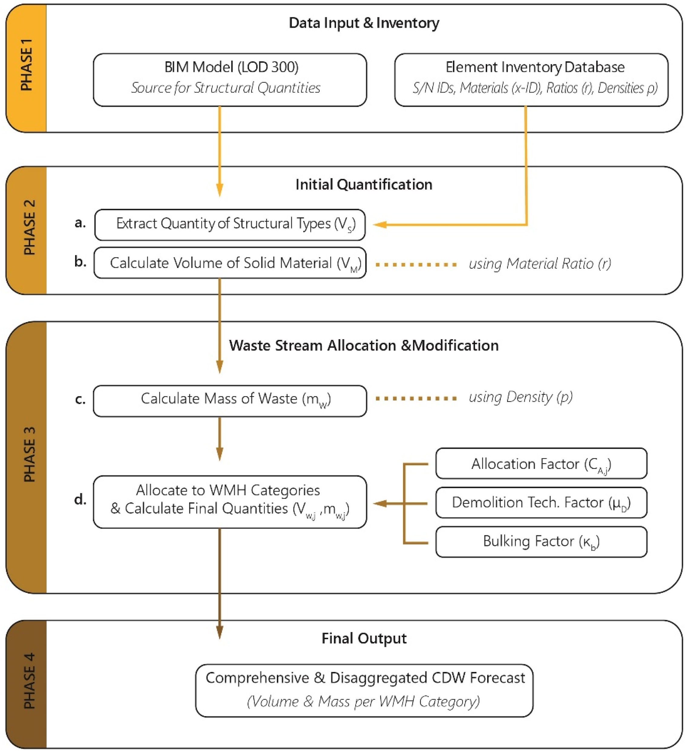 The initial volumes of these structural types (Vs) are directly extracted from a BIM model developed to Level of Development (LOD) 300 according to the specification of the BIMforum [15]. While the model is capable of processing data in various units (m3, m2, m), all quantities are subsequently normalized to volumetric units (m3) to ensure consistency. The volume of each solid material component (VM) is then calculated by multiplying the total structural volume (Vs) with the corresponding material ratio (r). Following this, the mass of each waste component (mw) is determined by applying the appropriate material density (ρ), sourced from an internal database comprising 13 distinct waste types (W01–W13). The final stage of the framework involves classifying these quantified material flows into eight waste management categories, in accordance with the principles of the EU waste hierarchy [21] (i.e., reuse, recycling, energy recovery, and disposal). This classification is governed by a set of material-specific allocation factors (CA,j), derived from a reference scenario. To account for real-world conditions, the model integrates two critical modifying parameters: the demolition correction factor (μD), which quantifies the impact of the selected demolition method (e.g., manual vs. mechanical) on material integrity, and the bulking factor (kb), which adjusts for the volumetric expansion of materials during the transition from solid to loose state. The output of the framework is a comprehensive and detailed prediction of CDW, specifying the volume and mass of individual material flows, as well as their distribution across the defined waste management categories. This systematic approach provides a robust foundation for the sustainable planning and execution of deconstruction projects involving historic buildings.