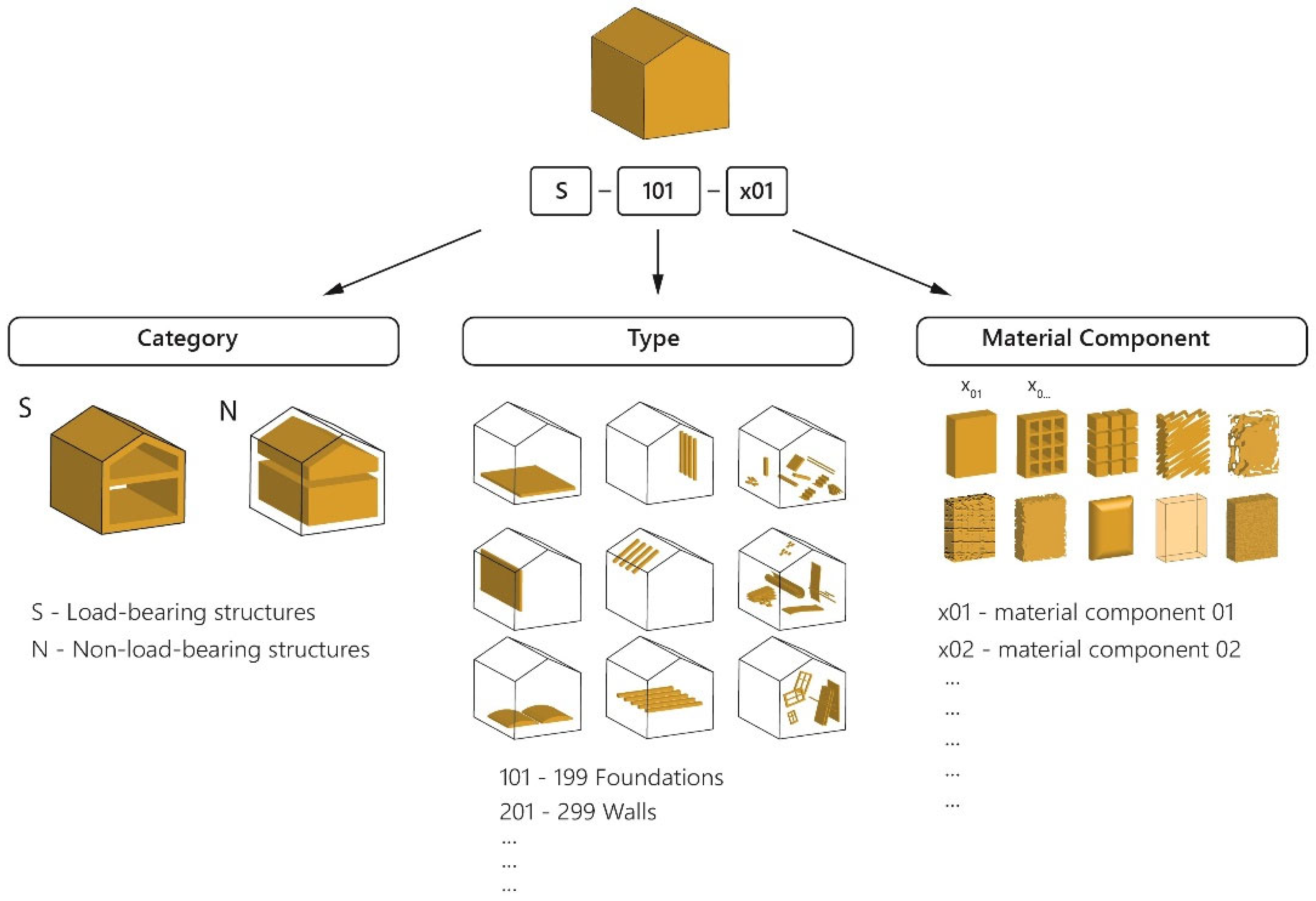 To ensure clear data management within the database, a hierarchical identification system was introduced. Load-bearing structures are denoted with the prefix S (structural), while non-load-bearing structures are marked with the prefix N (non-structural). Each structural type is linked to its constituent building materials, which are identified using an x prefix followed by a serial number. As a result, a classification system was established (Figure 3) that clearly indicates the structural origin of each material. This is essential for determining both the applicable demolition technologies and the feasible reuse or recycling pathways. The system is designed to be flexible and scalable: the identifier structure can be extended to accommodate additional building types. For instance, a Prussian vault floor present in this building is assigned the identifier S401 and comprises five primary material components: steel beam (x01), large-format brick (x02), mortar (x03), plaster (x04), and slag fill (x05). Accordingly, the large-format brick used in this specific floor structure is uniquely identified in the model as S401-x02.