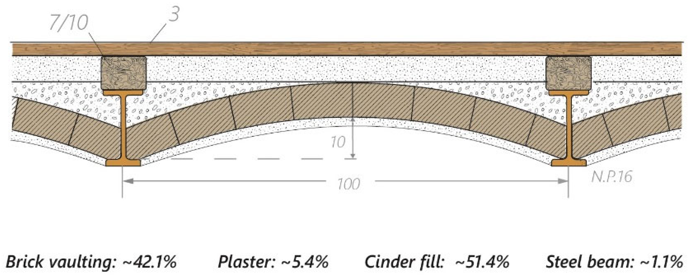 In the case of slab structures, additional calculations are typically required to determine the quantities of individual components. However, since the structural configurations of the slab types characteristic of the period are well known, the floor area—which can be accurately obtained from the model—is sufficient for the quantity calculations. An example of this is the Prussian vault, where the quantities of the steel beams, brick vault, slag infill, and plaster can be derived from the area of the modeled slab element. To support this, a detailed calculation was performed on a selected slab section, during which the specific quantities of each component per square meter of slab area were determined (Figure 5). Based on this approach, the exact material quantities can also be calculated for other floor structures with similar configurations.