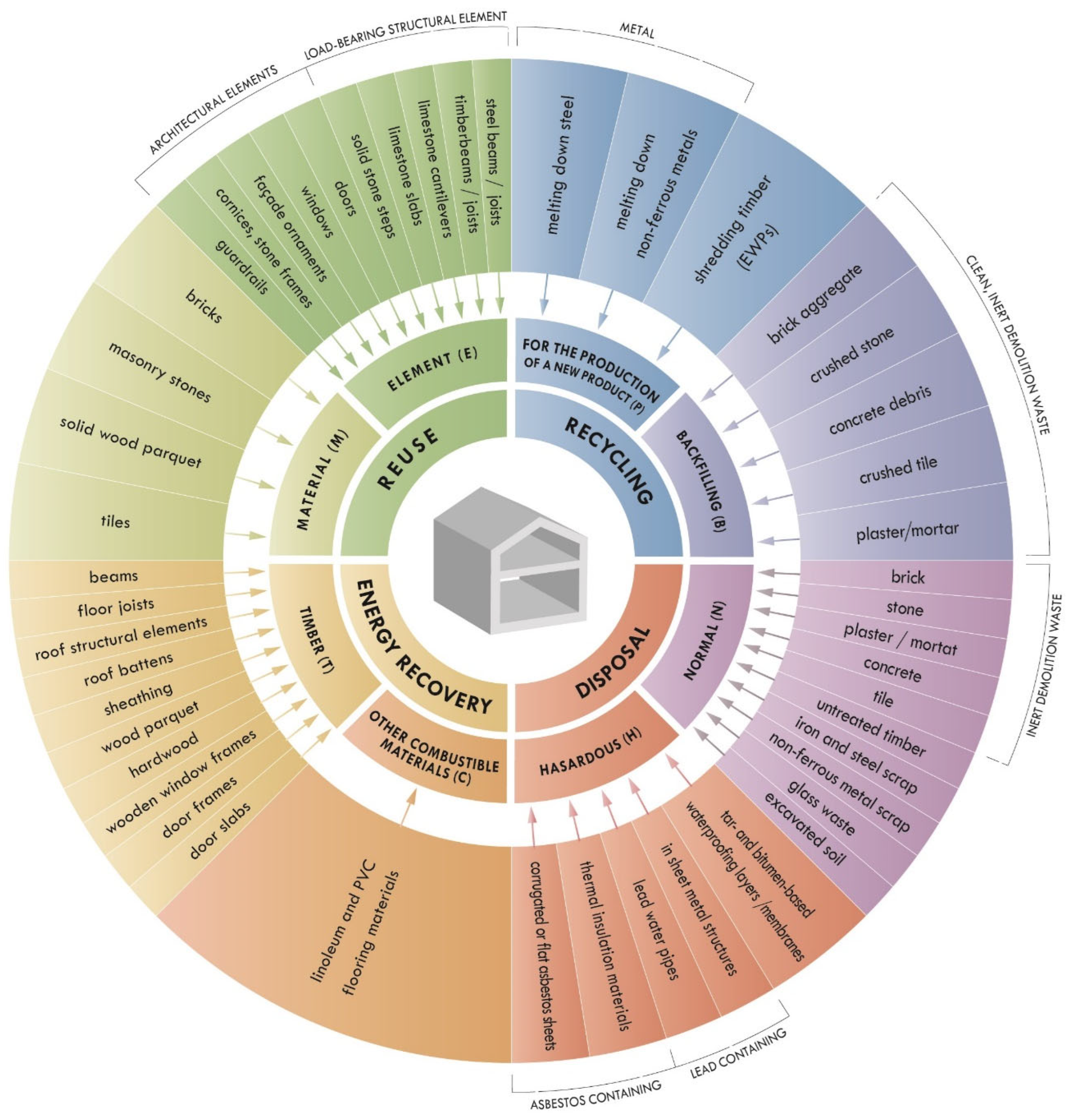 In contrast, the recycling/for the production of a new product subcategory includes materials such as steel or timber waste, which are processed into entirely new products through industrial means (e.g., melting, reprocessing). The most valuable and frequently recycled fraction is metal waste. Cast iron and steel waste streams may include cast-iron radiators, wastewater and heating pipes, and hot-rolled steel beams or railings. Following smelting in foundries, these materials can yield nearly 100% material recovery. Non-ferrous metals, such as copper and zinc, recovered from wiring, fittings, or plumbing components, can also be remanufactured into new products through similar metallurgical processes. Clean, untreated timber can be processed through shredding to produce a key raw material for engineered wood products. Only timber that is free from chemical treatments—such as fungicides, insecticides, or fire retardants—is considered suitable for recycling. The recycling/backfilling subcategory includes clean, inert demolition debris (e.g., brick, concrete), which can be mechanically crushed and graded, then used as construction aggregate for applications such as sub-base layers, grading, or excavation backfilling. The energy recovery/timber subcategory comprises clean and untreated wood that cannot be reused or recycled otherwise but can be combusted to generate heat and/or electricity. The energy recovery/other combustive material subcategory includes other non-hazardous combustible materials for which energy recovery through incineration is the only viable reuse pathway. The disposal/normal subcategory includes non-hazardous demolition waste that cannot be reused or recycled by any other means and is therefore disposed of in regulated landfills. While this group predominantly consists of inert demolition debris, untreated wood (e.g., structural timber, doors and windows), metal waste, glass waste, as well as soil and slag excavated during demolition works may also be included. The disposal/hazardous subcategory comprises waste classified as hazardous to human health or the environment, such as asbestos-containing materials or bauxite concrete. These materials must be collected, treated, and permanently disposed of or destroyed in accordance with legal regulations, typically in sealed and secure landfill sites designed for hazardous waste.