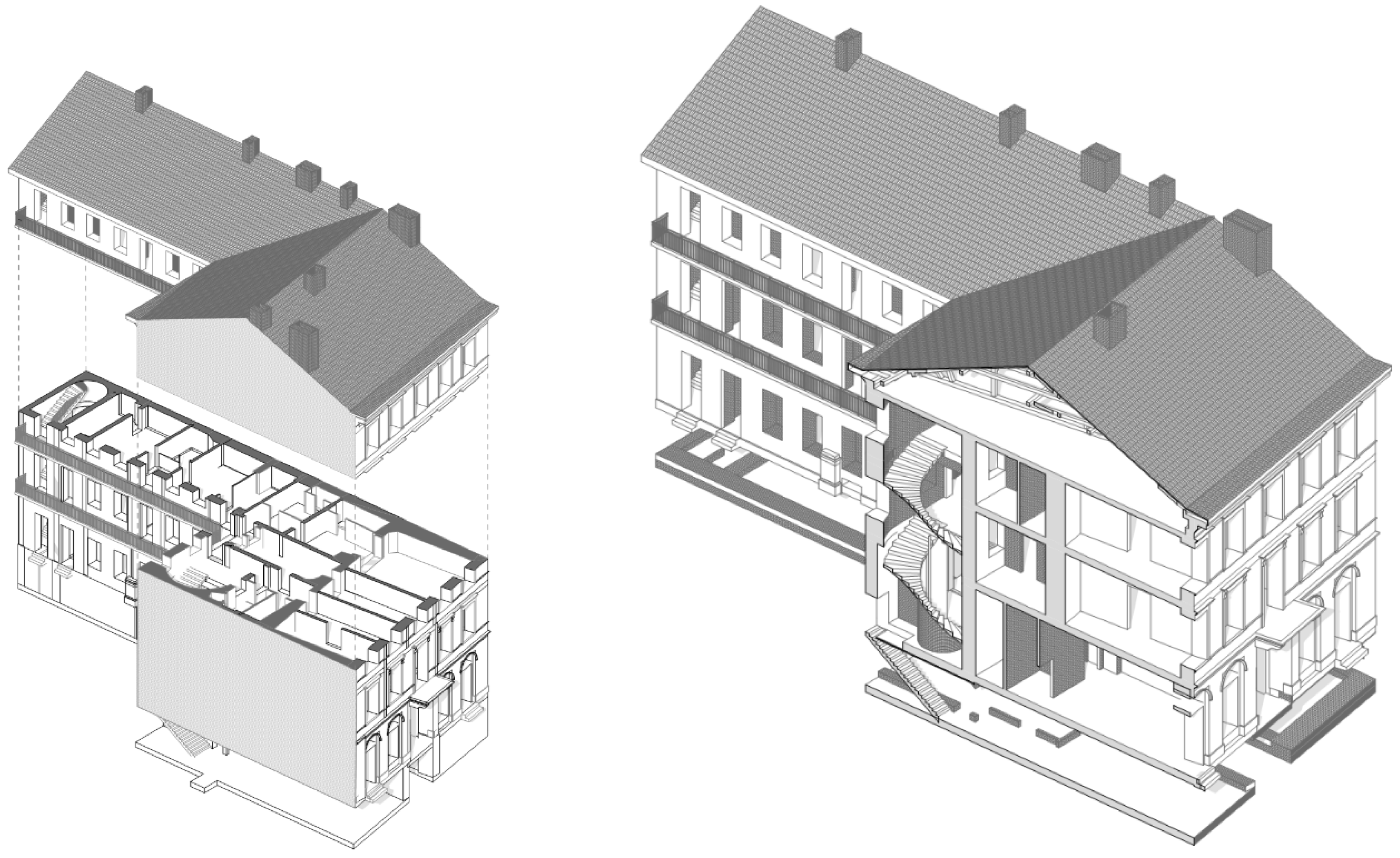 It is assumed that a model of the examined building is developed at LOD 300 according to the LOD Specification published by the BIMforum [15], including the main load-bearing elements, such as foundations, walls, columns, slabs, beams, roof structures, the chimneys, the partition walls, the stairs, the openings, and the railings. LOD300 means that individual components are represented with accurate dimensions; however, subcomponents (e.g., the joists in a timber floor structure) are not modeled separately. Furthermore, the model does not include composite structures, mechanical or electrical equipment, or furniture. This level of detail can still be considered realistic in the context of surveying existing buildings; constructing a model with higher accuracy, however, becomes extremely time-consuming and may not be economically justified.