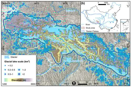 Location of the study area. Overview of the Study Area (a) Elevation, glacial lakes, and glacier distribution; (b) Location of the study area.