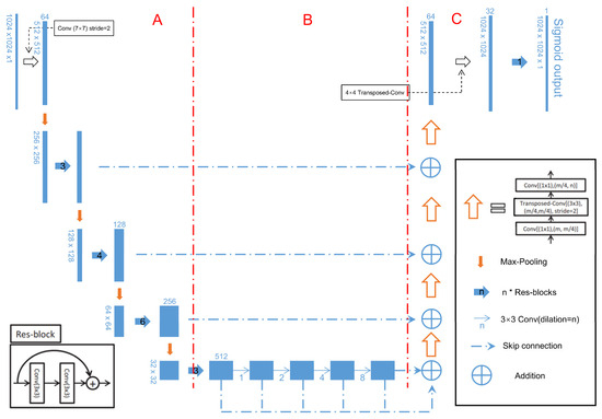 Deep learning technology roadmap. The asterisk “*” represents the convolution operation. Part A is the encoder of D-LinkNet. D-LinkNet uses ResNet34 as encoder. Part C is the decoder of D-LinkNet, it is set the same as LinkNet decoder. Original LinkNet only has Part A and Part C. D-LinkNet has an additional Part B which can enlarge the receptive field and as well as preserve the detailed spatial information.