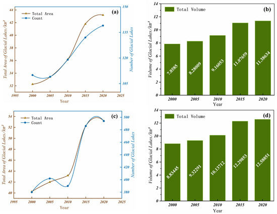 (a) Greater than 0.08 km2 line chart of glacial lake area and number. (b) Greater than 0.08 km2 glacial lake volume histogram. (c) Line chart of glacial lake area and number. (d) Glacial lake volume histogram.