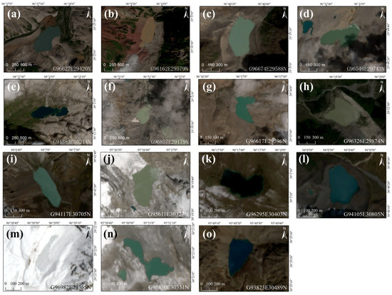 Traditionally, glacial lake investigations have relied on field surveys, but the remoteness of high-altitude regions and the incompleteness of historical GLOF records [15,17] have limited their adequacy; the advent of satellite-based Earth observation missions, particularly long time-series and high-resolution imagery, has nevertheless greatly improved the detection and assessment of GLOF hazards [18]. For example, Komori used imagery from Corona KH-4A, Hexagon KH9-9, Landsat7/ETM+, and ALOS/PRISM in combination with field surveys to study GLOFs in Bhutan [19]. Nie et al. [10] reviewed and verified more than 60 historical GLOF events in the Himalayas using remote sensing and field investigations, identifying several previously unreported events and correcting others. Veh et al. [20] applied automatic detection methods on Landsat imagery (1988–2016) to identify 10 previously unreported GLOF events in the Himalayan region. Liu et al. [21] identified 37 GLOF events from 33 lakes in Tibet, correcting three previously unreported events. These studies highlight the incomplete nature of existing GLOF records and underscore the need for further exploration to uncover potentially unreported GLOF events.