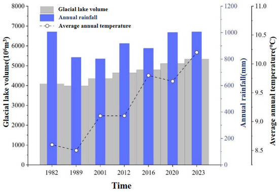 Using the formula for glacial lake volume, it is found that since 1989, the total volume of glacial lakes has increased annually, from 3979.41 × 106 m3 in 1989 to 5345.29 × 106 m3 in 2023, representing a change of 1365.88 × 106 m3 (34.32% increase) and an average annual increase of 40.18 × 106 m3. Comparisons indicate that the total glacial lake volume has grown in parallel with rising temperatures and rainfall, showing a positive correlation. To further explore this relationship, a lag-effect analysis was conducted between the annual glacial lake area growth rate and climate variables, considering 1–3-year time lags. The results show that the lake-area growth rate responds most strongly to temperature increases with a 1–2-year lag, while precipitation shows a weaker but still significant lagged effect of 2–3 years. This suggests that the expansion of glacial lakes is not only directly driven by current climate conditions but also influenced by cumulative climate effects over preceding years. Despite the increase in total volume, the average volume of glacial lakes has shown a decreasing trend annually, which is related to both the increasing number of lakes and the occurrence of GLOFs. Individual GLOFs reduce the water volume of specific lakes, while new lakes form as a result of ongoing glacier retreat and melting. In 2023, the largest glacial lake volume was 2.4 times that in 1982. Consequently, total glacial lake volume has increased, whereas average volume per lake has decreased, indicating that the observed changes are closely linked to both lake expansion and climate-driven hydrological accumulation over multiple years (Figure 8).