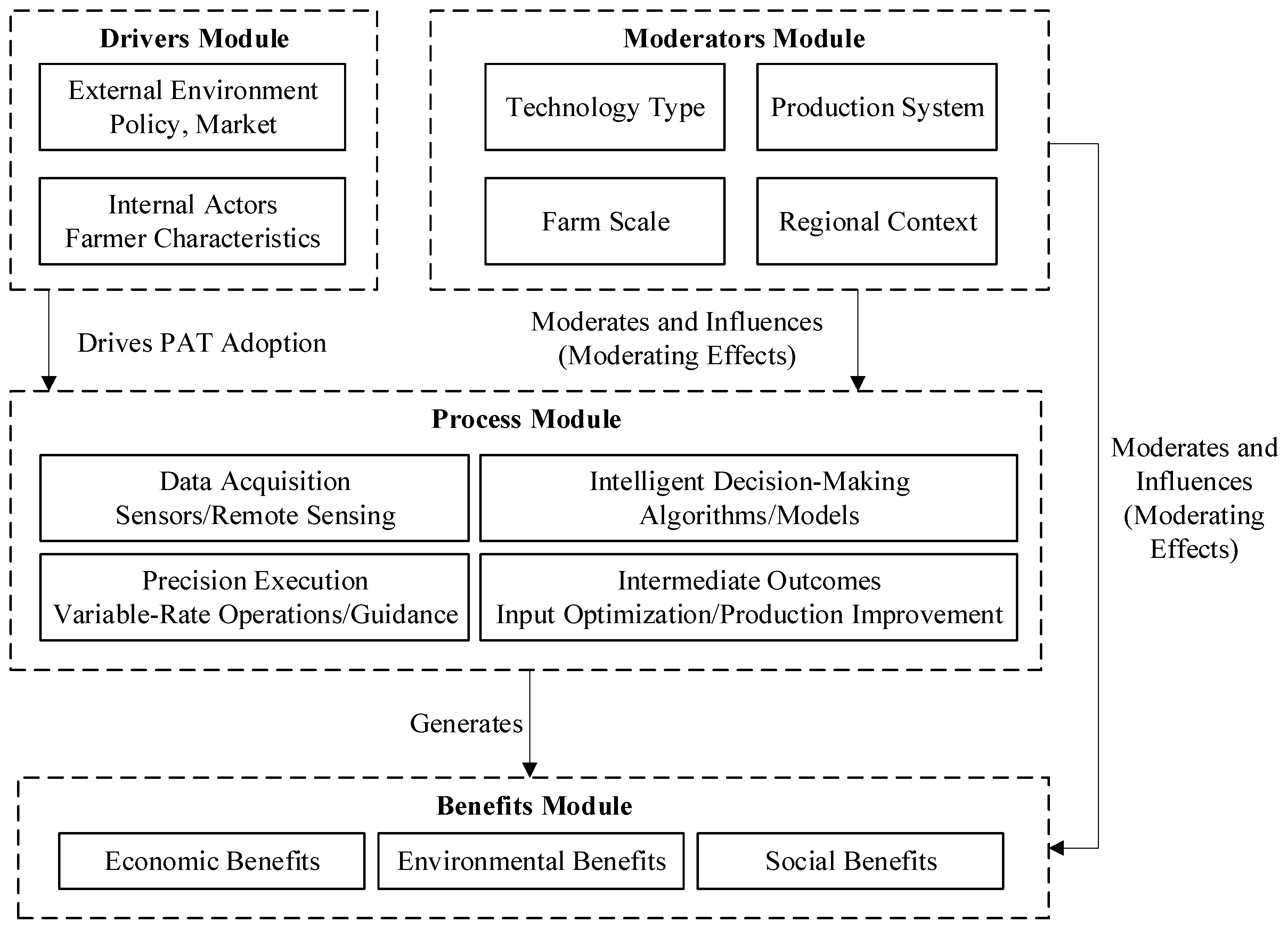 Thirdly, the Moderators Module: This framework emphasizes that the transformation from “processes” to “benefits” is not linear but is significantly moderated by multiple contextual factors. These moderating variables include: (1) the attributes of the technology itself (e.g., compatibility, complexity); (2) farm operational characteristics (e.g., scale, degree of land fragmentation); (3) type of production system (e.g., field crops, facility agriculture); (4) regional development context (e.g., infrastructure, institutional environment). They act like “filters,” collectively modifying and determining the extent and manifestation of the final benefits of the technology [