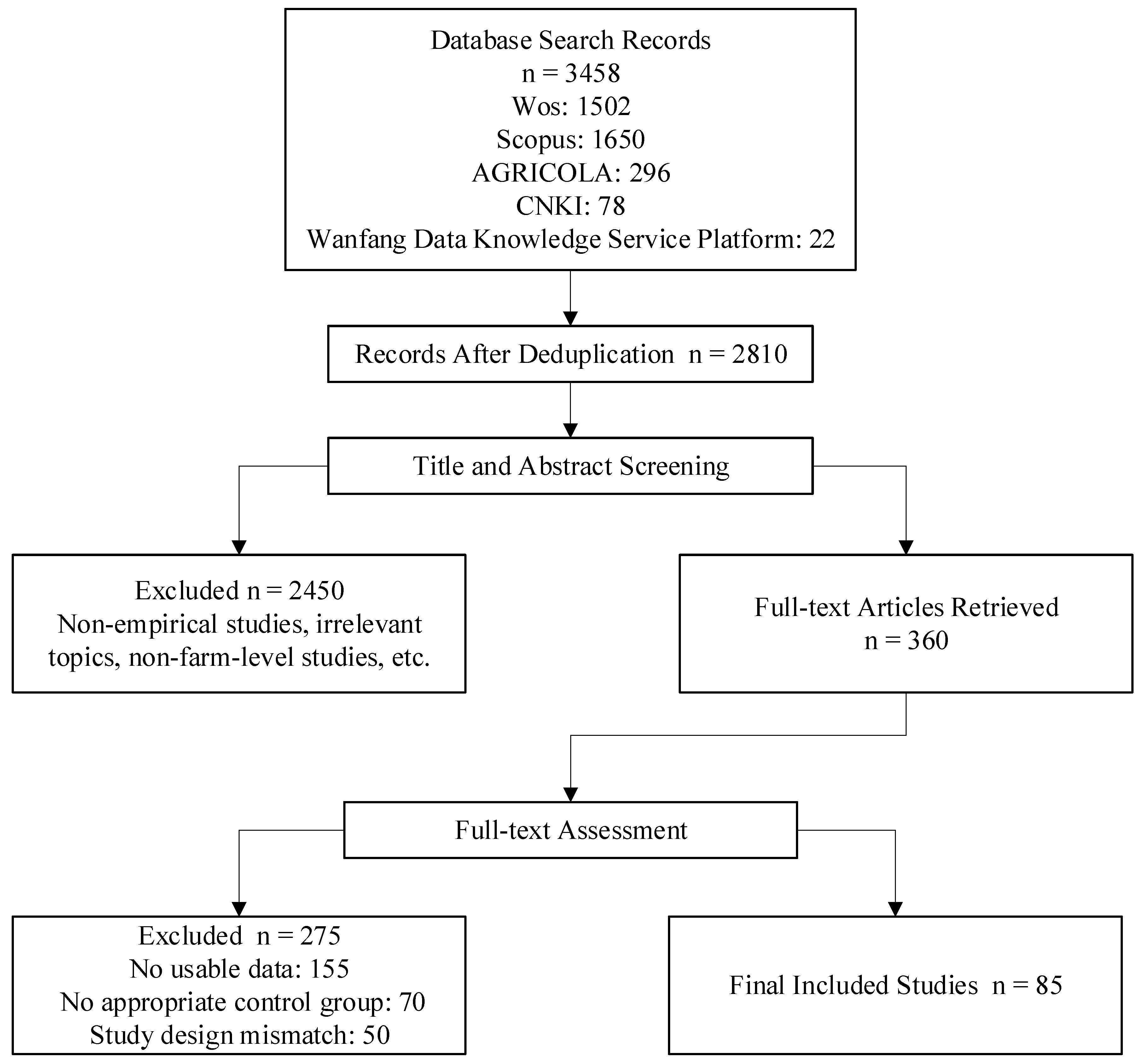 Based on the aforementioned research gaps and intended contributions, this study employs a meta-analysis to address three key questions. Firstly, to systematically evaluate the average impact of PAT adoption on key economic and environmental indicators globally. Secondly, to investigate the moderating effects of factors like technology characteristics and farm structure to explain heterogeneity. Finally, to propose differentiated recommendations for farmers, R&D institutions, and policymakers.