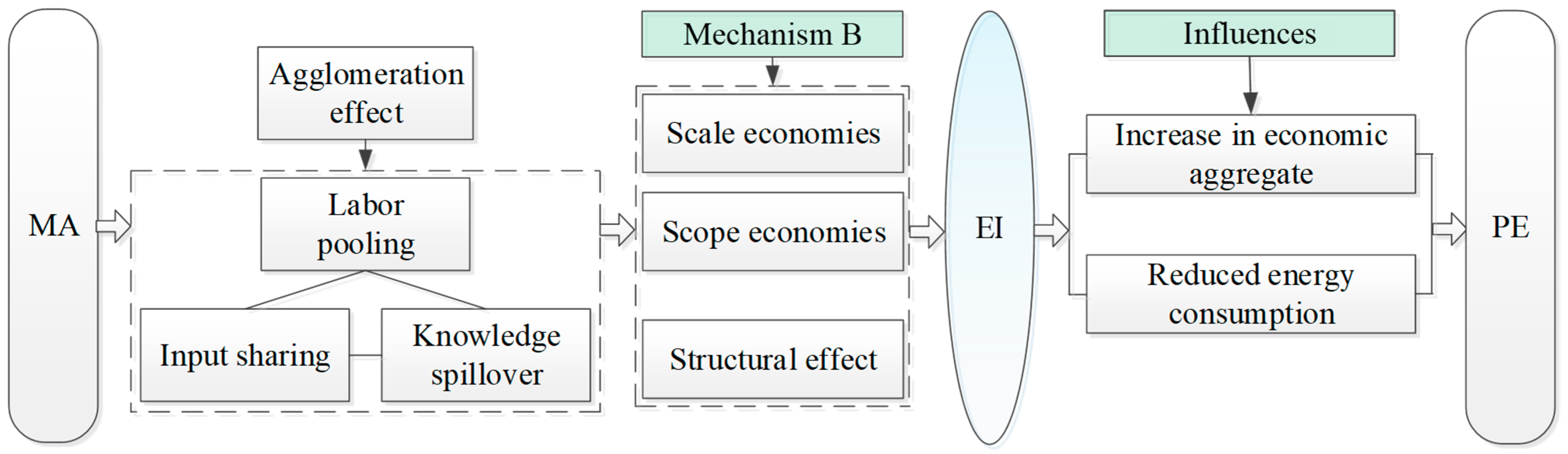 - Wang, J.; Sun, F.; Lv, K.; Li, W.; Luo, L. Industrial agglomeration and firm energy intensity: How important is spatial proximity? Energy Econ. 2022, 112, 106155. [Google Scholar] [CrossRef]