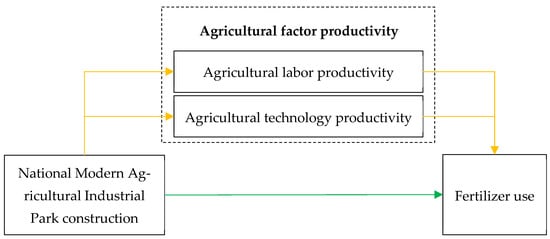 The construction of NMAIP represents a significant transformation in agricultural development. These parks are centered on efficient resource allocation and optimization of production models, emphasizing improving production efficiency. This study explores two key dimensions through which NMAIP may reduce fertilizer use: agricultural labor and technology productivity. These dimensions correspond to the fundamental elements of agricultural production: labor and technology inputs. Improvements in both areas directly affect economic efficiency and resource utilization, which can, in turn, lead to reduced chemical fertilizer consumption [1,27].
