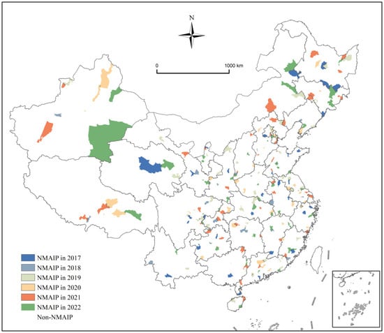This study utilizes an unbalanced panel dataset of 1289 counties in China from 2014 to 2022. The primary dependent variable is county-level chemical fertilizer use. Fertilizer data are obtained from the agriculture chapters of the China County Statistical Yearbook, the China Statistical Yearbook for Regional Economy, and provincial, municipal, and county statistical yearbooks, supplemented by the EPS database [51]. These sources report the annual quantities of nitrogen, phosphate, potash and compound chemical fertilizers actually applied in agricultural production. So we can construct the total amount of chemical fertilizers used in each county-year. The list of NMAIP is compiled from official documents jointly issued by the MARA and MOF, ensuring comprehensive coverage of all officially recognized parks (Figure 3). To guarantee at least one year of post-implementation observation for identifying the fertilizer reduction effect, the 50 NMAIPs designated in 2023 are excluded from the sample. Data on economic, agricultural, and social development used as control variables are primarily sourced from the China Statistical Yearbook for Regional Economy and the China County Statistical Yearbook, complemented by provincial, municipal, and county statistical yearbooks. The study also consults the National Economic and Social Development Statistical Bulletin and relevant datasets from the EPS platform to supplement missing indicators. During data cleaning and processing, counties with extensively missing data were removed to ensure the completeness and representativeness of the dataset. For sporadically missing observations, interpolation methods were applied so as to minimize their impact on the empirical analysis.