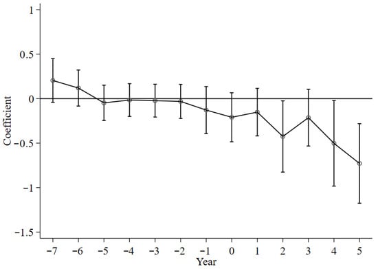 To ensure the validity of the DID methodology, this study conducted a rigorous pretest based on the parallel trends hypothesis. The parallel trends assumption posits that, in the absence of the NMAIP policy, the trends in fertilizer use for both the treatment and control counties should follow similar trajectories over time. This research employs the event study method to test whether this assumption holds and to investigate the dynamic effects of NMAIP construction on fertilizer use.