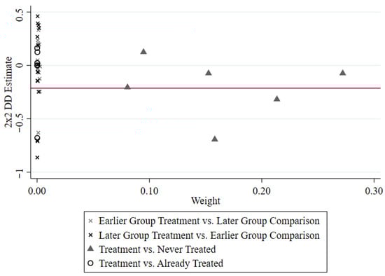The Goodman-Bacon (2021) [54] approach decomposes the total DID estimator into a weighted average of four distinct categories to evaluate the impact of different groupings on the overall estimation. The decomposition results in Figure 5 and Table 3 illustrate the weights assigned to each category and their contribution to the final estimates. Specifically, the results show that the control group, consisting of counties treated later, accounts for 97.10% of the total weight. This indicates that the DID estimates in this study are predominantly derived from counties not yet affected by the policy, thereby avoiding the potential bias that could arise from over-reliance on counties in the treatment group that experienced later policy implementation. As a result, the estimates in this study are robust and not subject to substantial estimation bias.