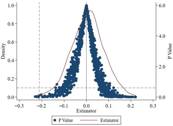 A placebo test is conducted to ensure the robustness of the results and to rule out the influence of non-randomized policy shocks or potential unobservable confounders. Specifically, this study randomly reassigned the treatment groups and simulated hypothetical policy implementation time points. A regression analysis was then performed on these placebo groups, repeated 1000 times, to assess the stability and consistency of the results across simulated scenarios.