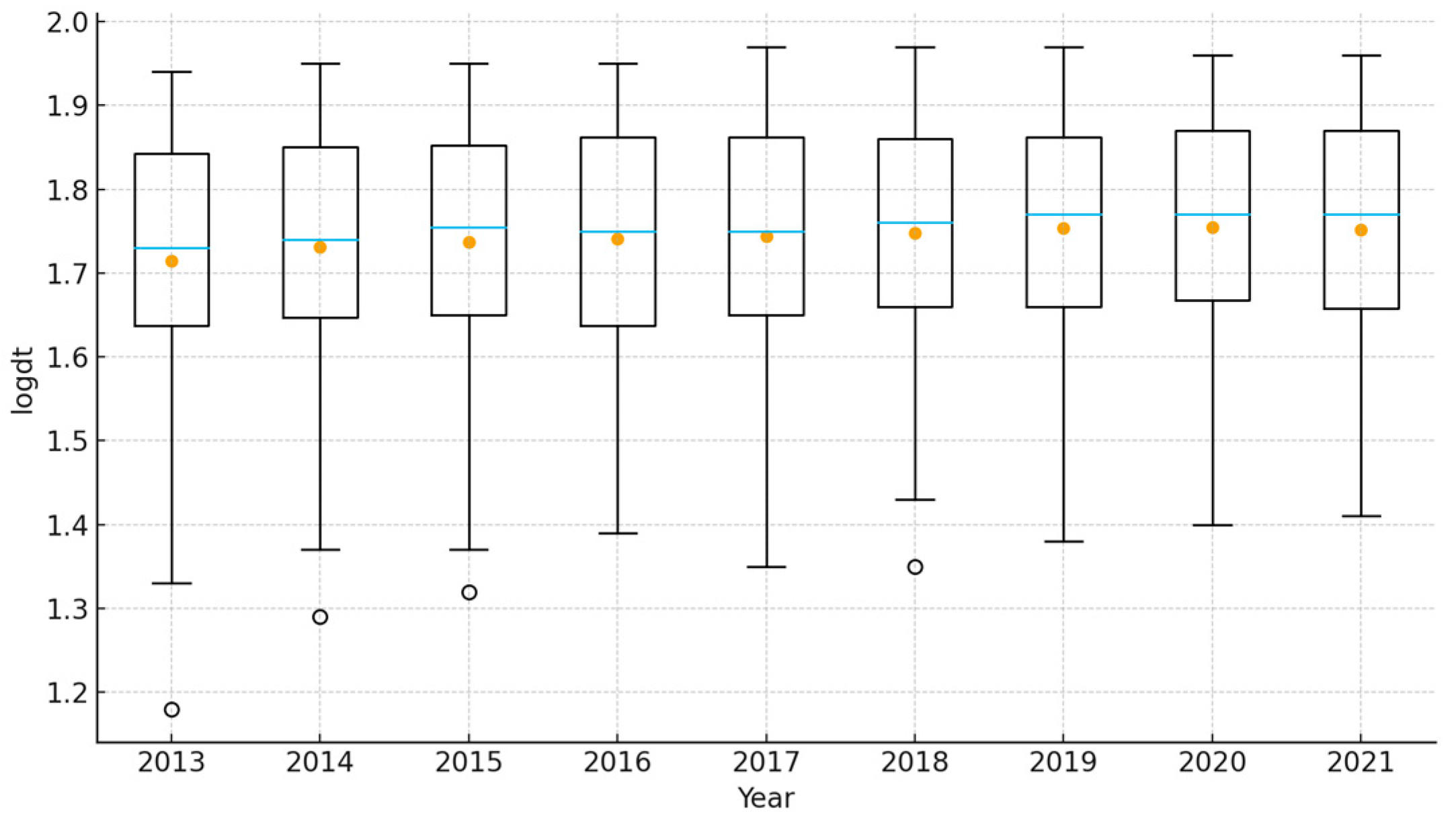 | logdt | −0.267 ** (−2.01) | −0.173 * (−1.83) |
