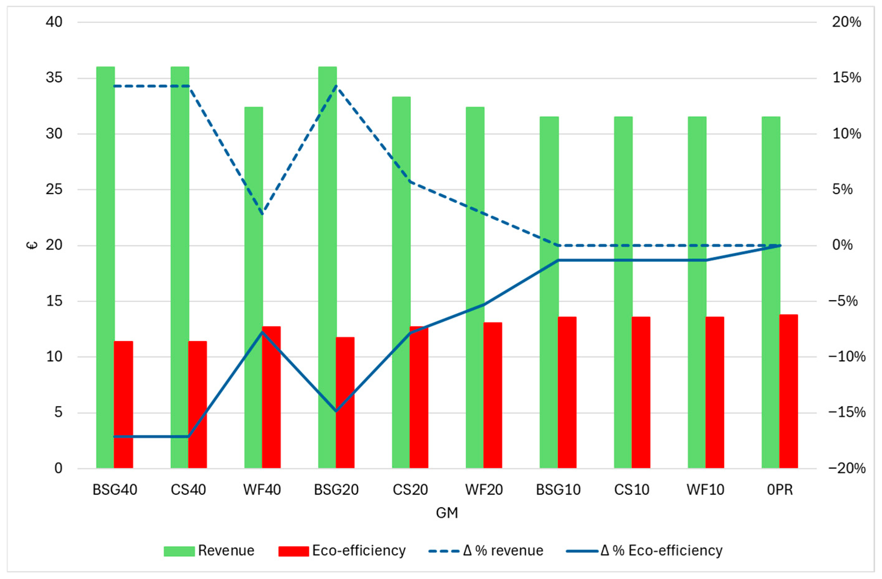Figure 1 shows the comparison between the revenue (green columns) and eco-efficiency indicator (red columns) for the different GMs by considering the percentage variation, in relation to the baseline (0PR), of revenue (dashed blue line) and eco-efficiency (continuous blue line). Notably, the highest peat replacements (40%) show the best performance both for the revenues and eco-efficiency, except for WF40. This is confirmed by the strong percentage variation in both revenue and eco-efficiency (+14.3% and −17.13%, respectively). On the contrary, peat replacements of 10% show weak performance for the eco-efficiency (−1.3%) and no revenue performances.