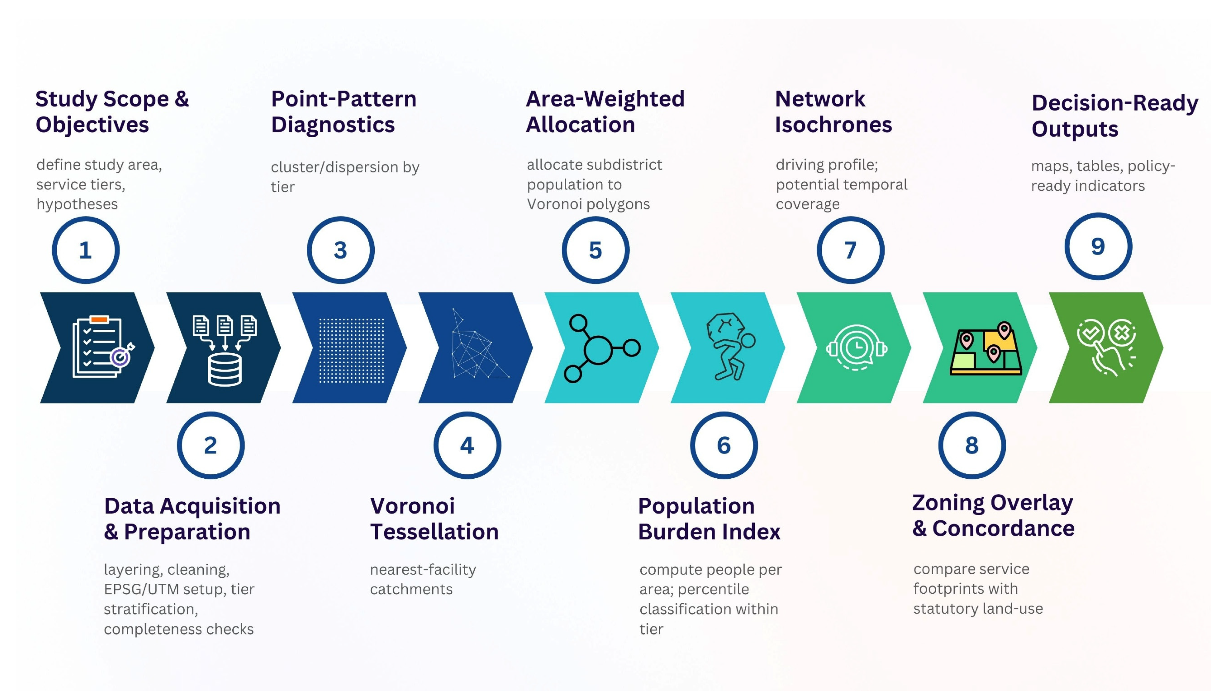 | Al-Naabi et al. (2025) [16] | Muscat, Oman | Voronoi & Buffer Analysis | Combined Voronoi polygons with distance thresholds to flag underserved pharmacy locations, serving as a direct template for geometric screening. |