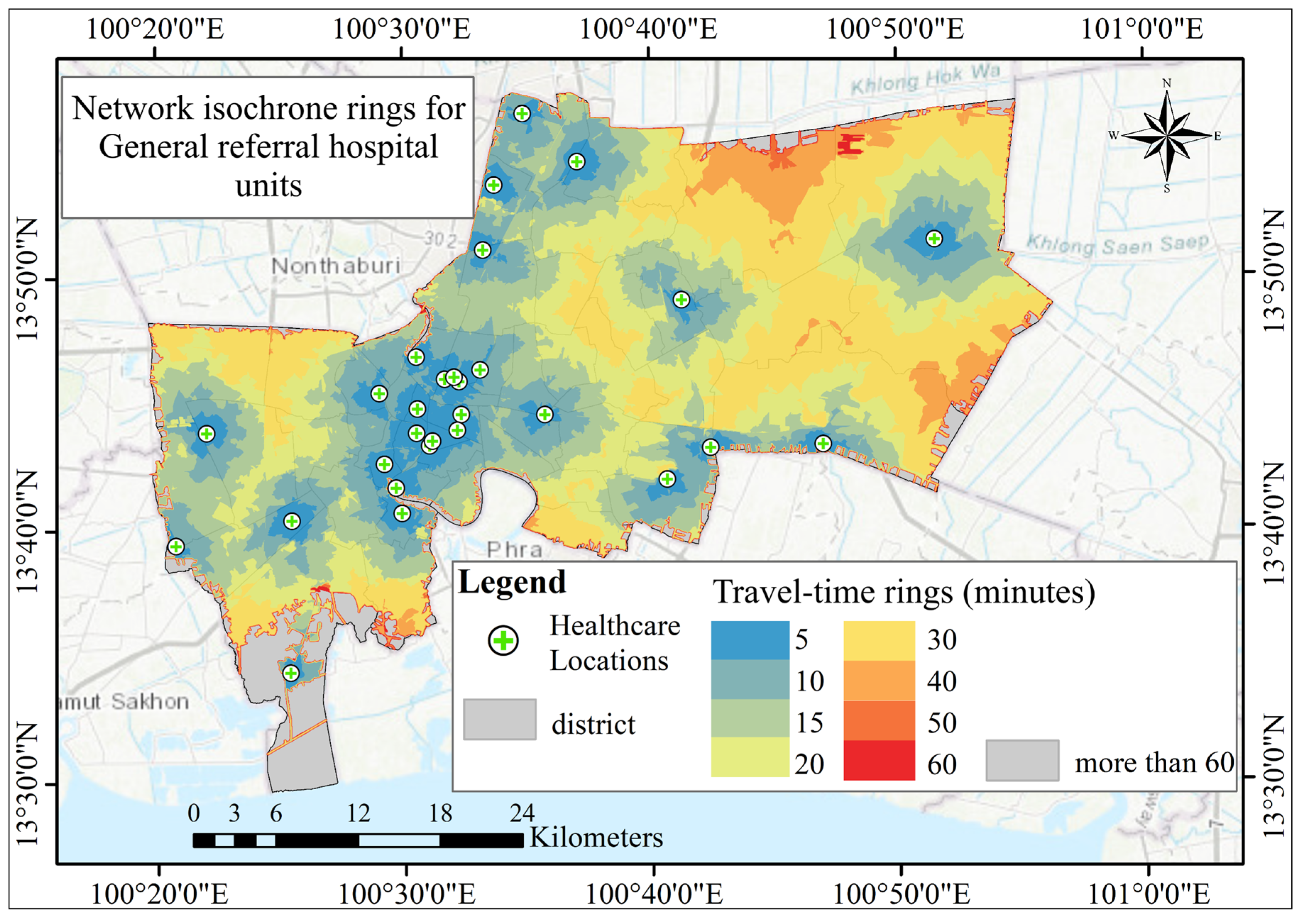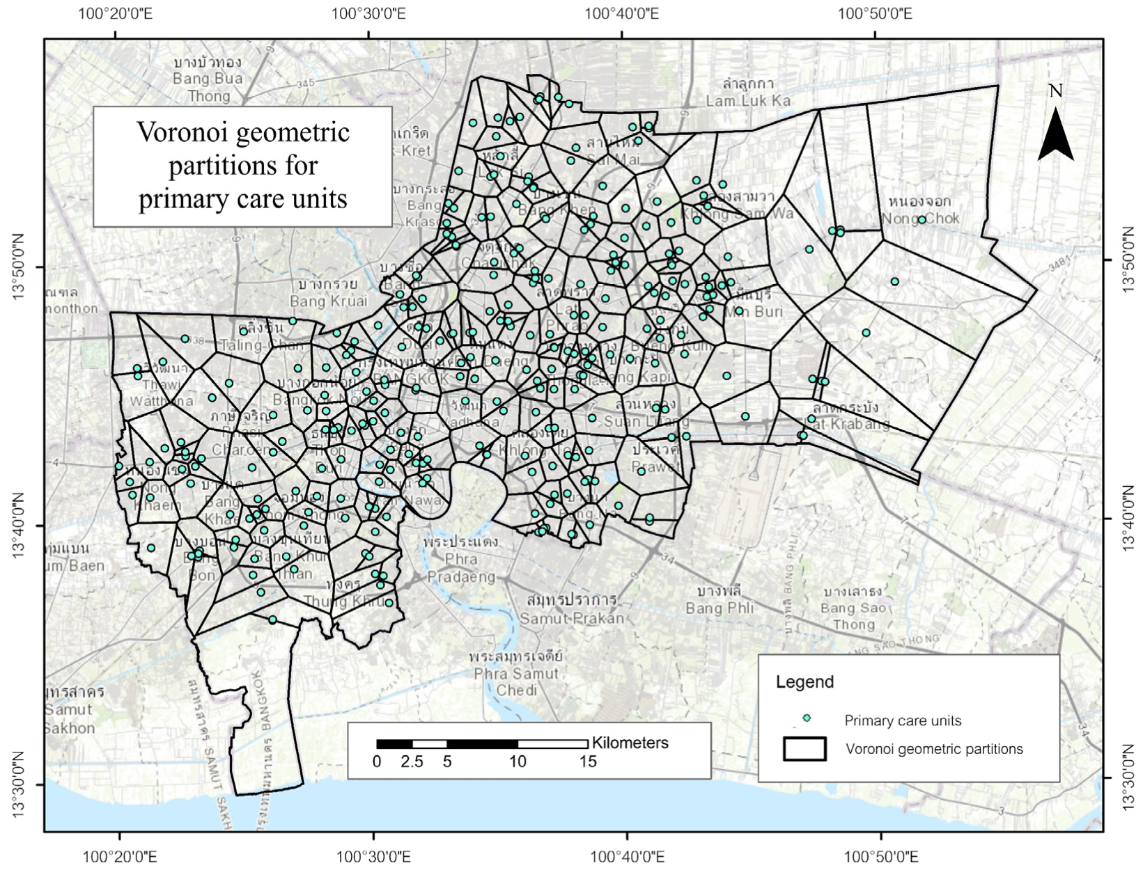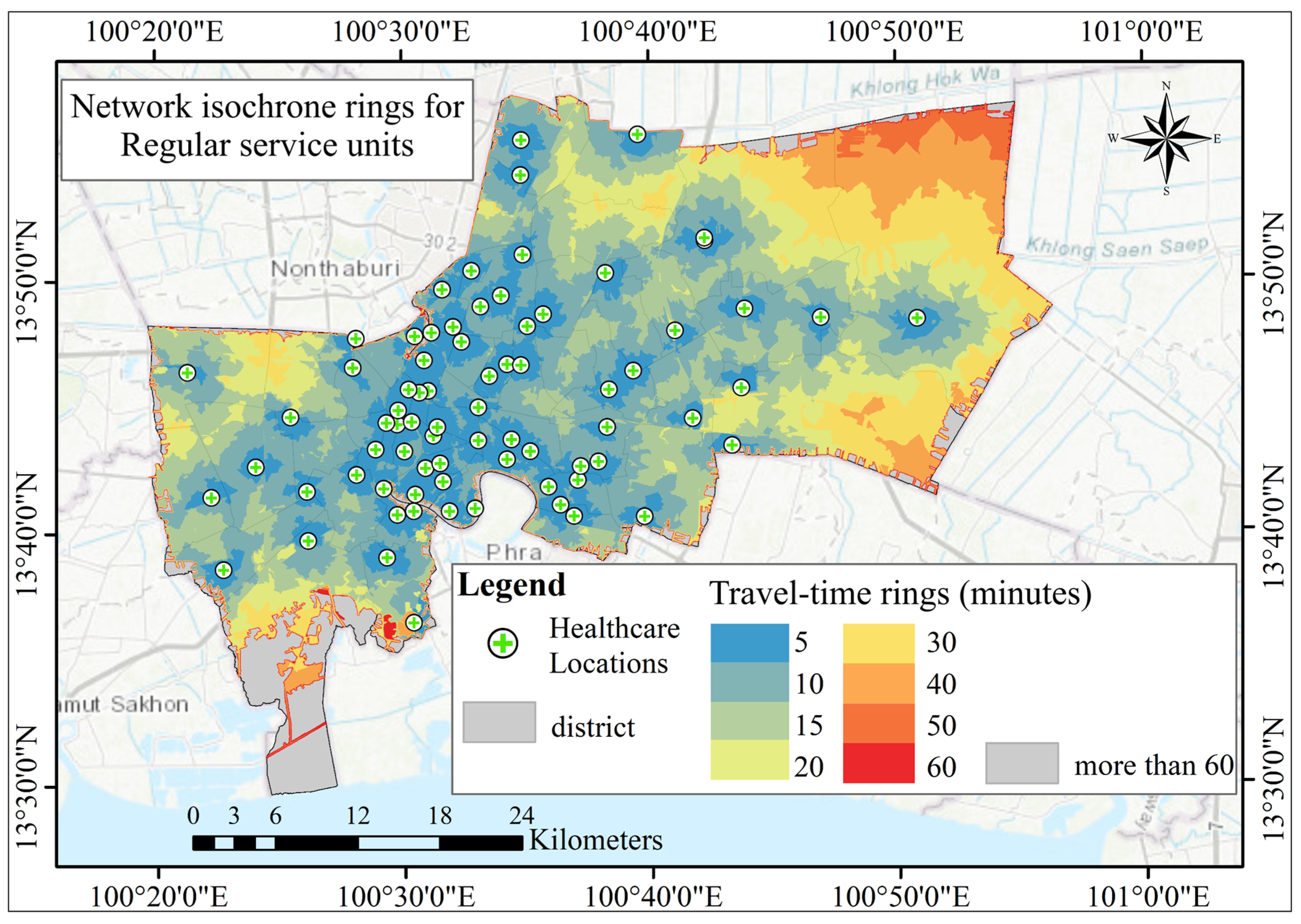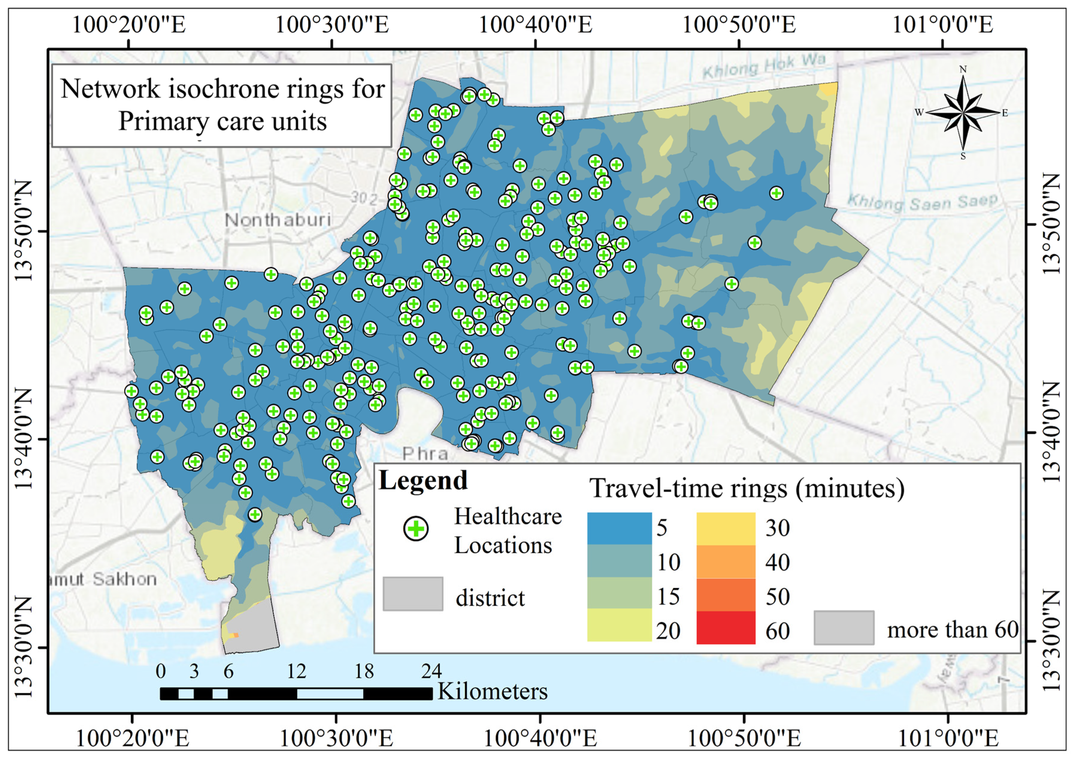 Boonprong, S.; Punturasan, N.; Kamsing, P.; Torteeka, P.; Cao, C.; Piolueang, N.; Satapanajaru, T.; Xu, M. Sustainable Urban Healthcare Accessibility: Voronoi Screening and Travel-Time Coverage in Bangkok. Sustainability 2025, 17, 11241. https://doi.org/10.3390/su172411241