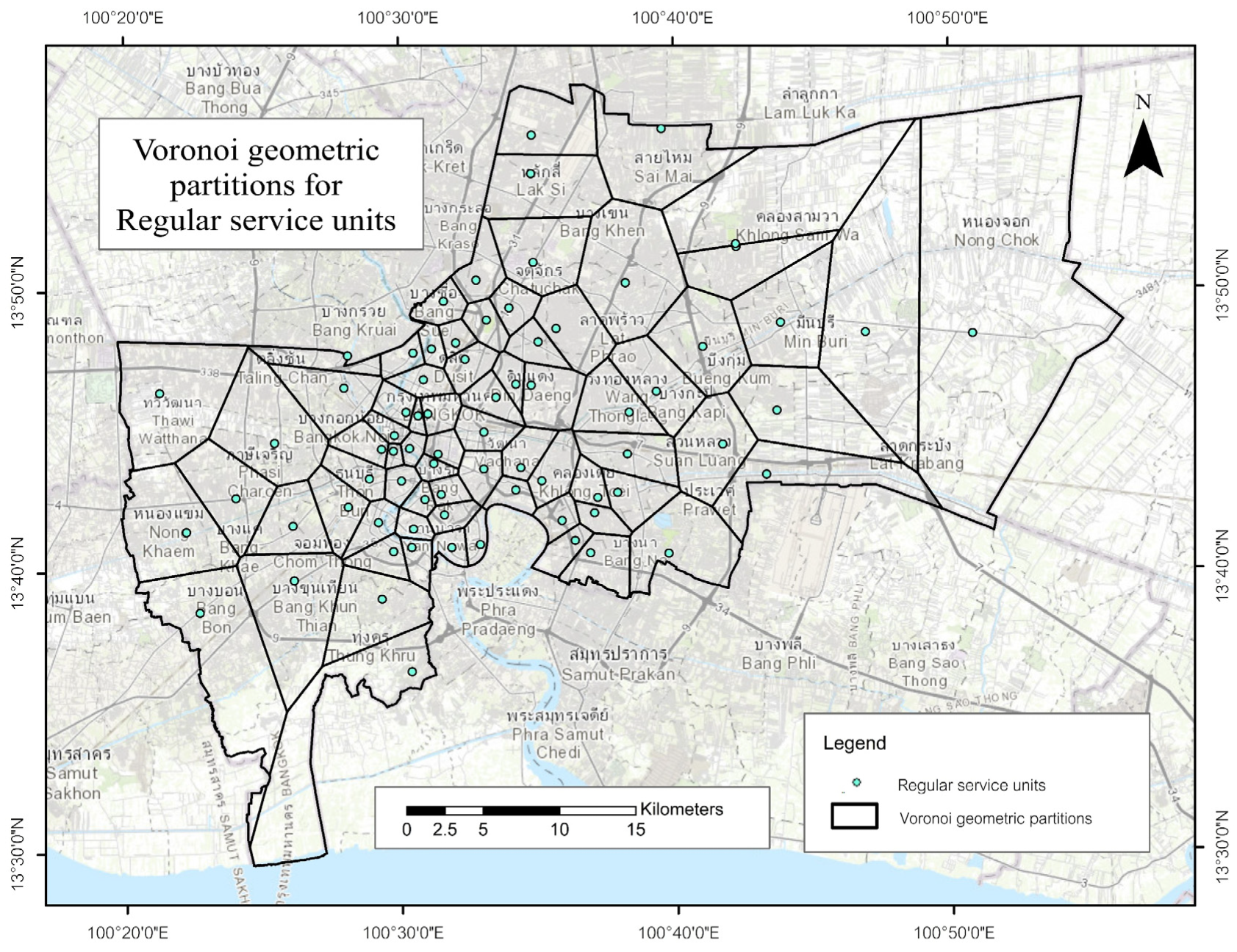 | Alamri (2023) [17] | (General Framework) | Voronoi & Network Routing | Combined Voronoi catchments with Dijkstra’s algorithm, validating the compatibility of Voronoi geometry with network-based travel time modeling. |