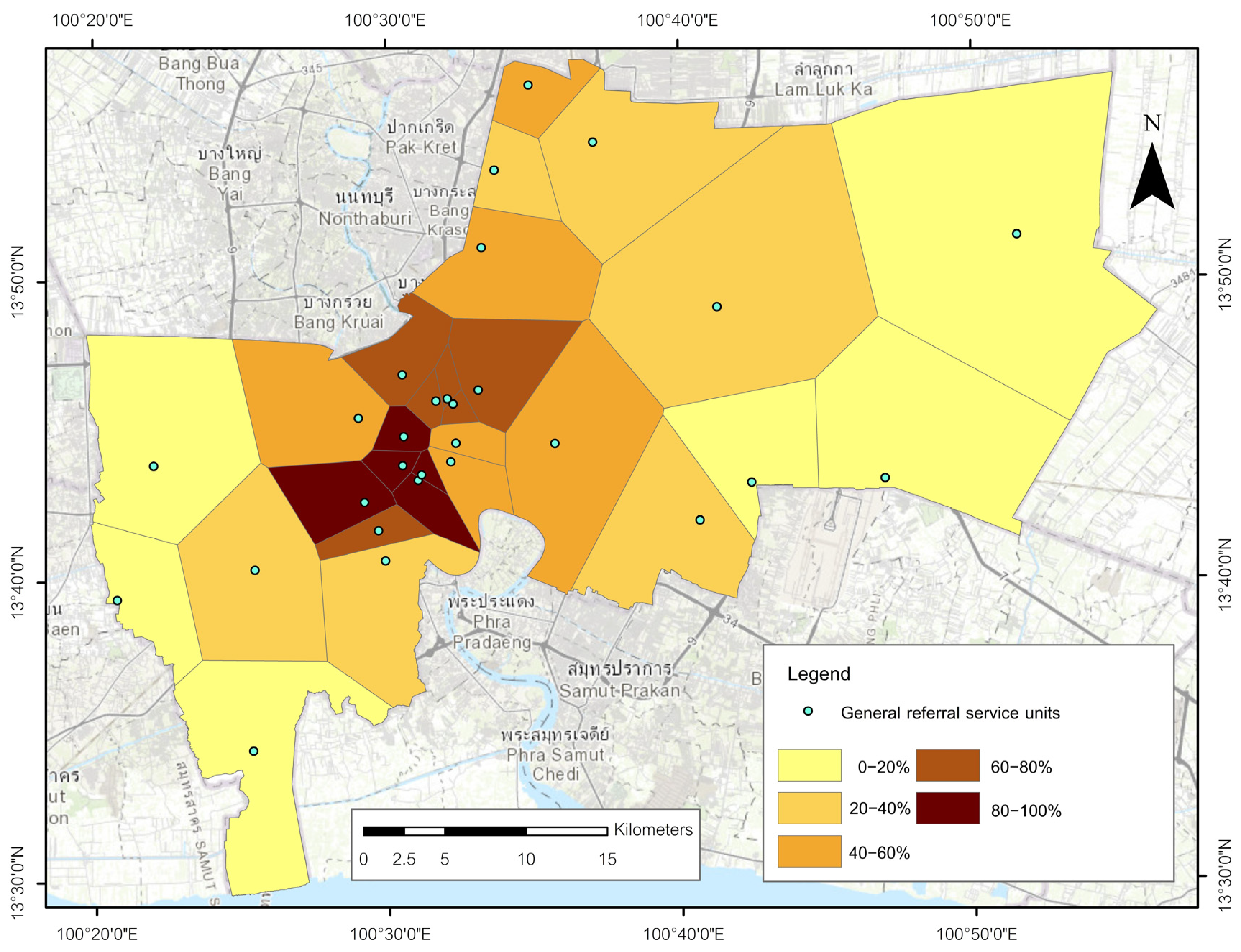 - Sreemongkol, K.; Lohatepanont, M.; Cheewinsiriwat, P.; Bunlikitkul, T.O.; Supasaovapak, J. GIS Mapping Evaluation of Stroke Service Areas in Bangkok Using Emergency Medical Services. ISPRS Int. J. Geo-Inf. 2021, 10, 651. [Google Scholar] [CrossRef]