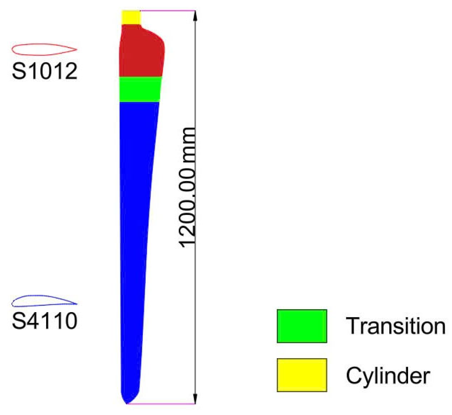 | Tip (blue) | S4110 | The design tapers towards the wingtips. Increase CL/CD at low wind speed, and energy exploitation |