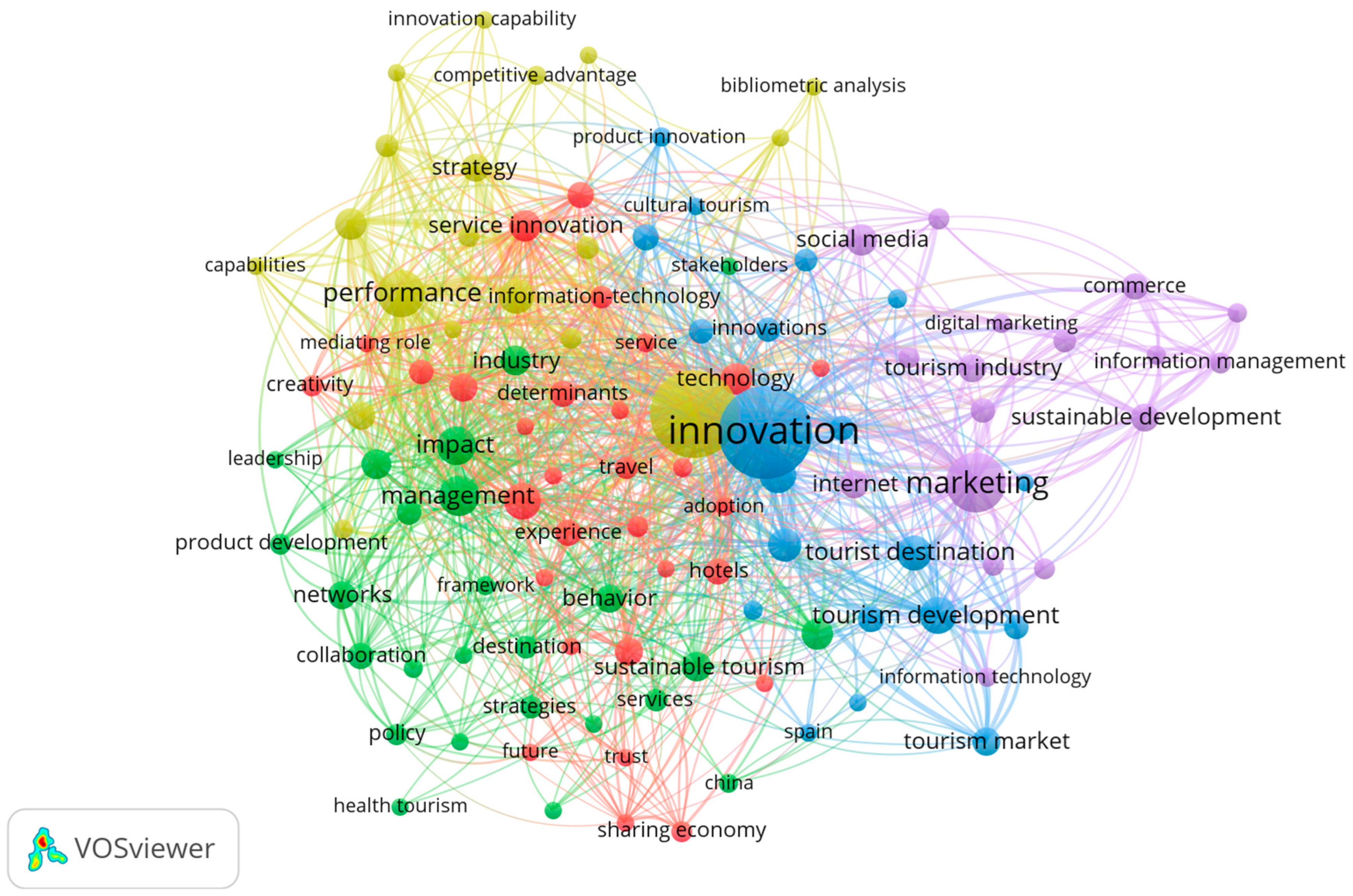 - Cluster 1 (red): organisational innovation. The red cluster groups terms associated with organisational and technological innovation, such as technology, experience, hotels, adoption, and industry. This group reflects the focus on the application of innovation in the tourism and hospitality sector, including technology adoption and digital transformation.