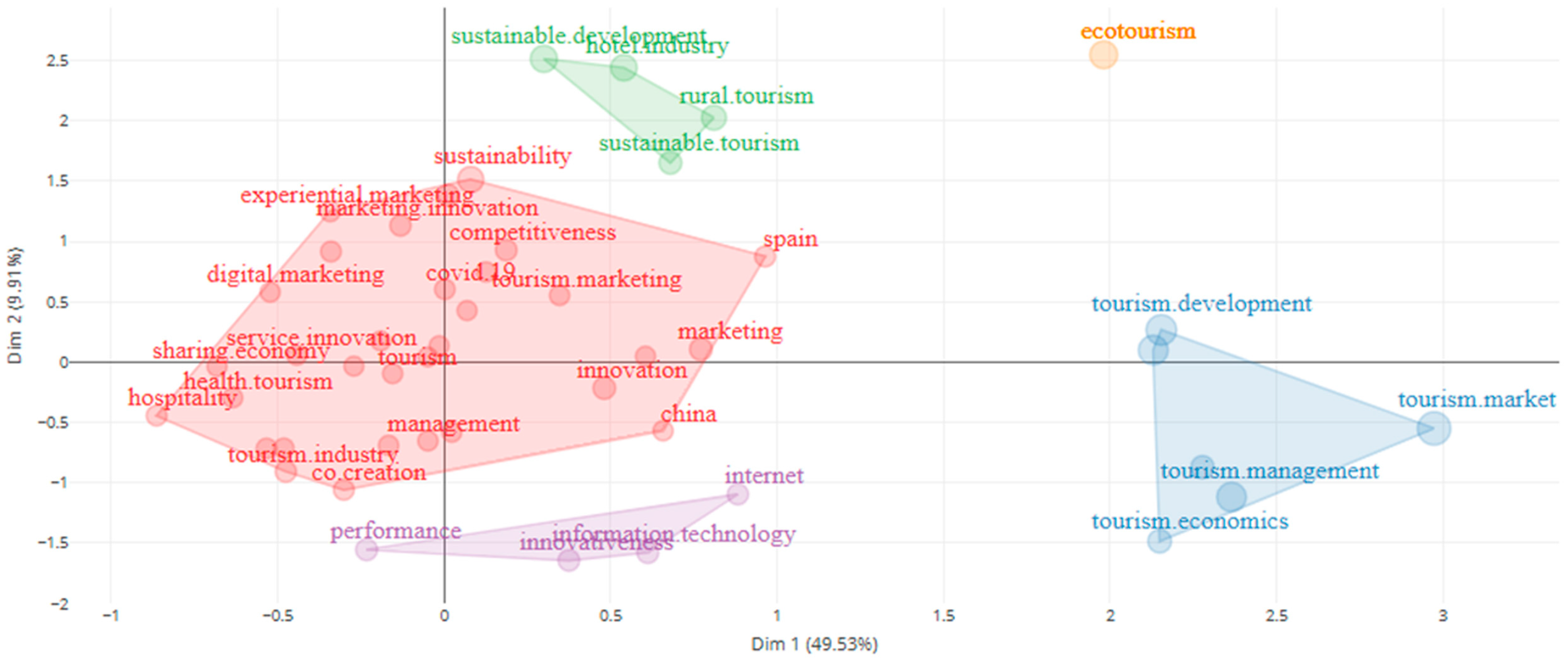 - Group 2 (blue): sustainable tourism. The blue group refers to sustainable tourism and destination development, highlighting terms such as tourism development, tourism market, sustainable tourism, tourist destination, and information technology. This group highlights the link between innovation, sustainability, and tourism development planning.