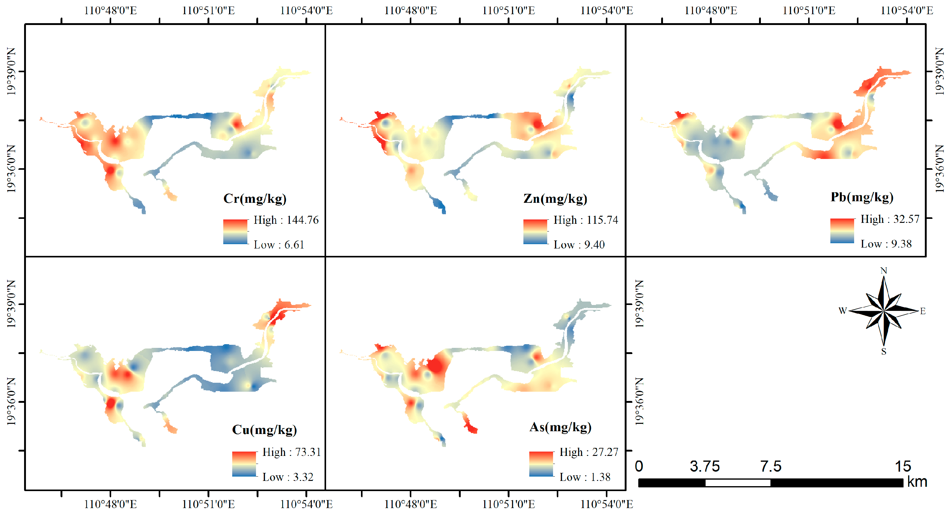 3.1. Spatial Distribution of Heavy Metal Concentrations