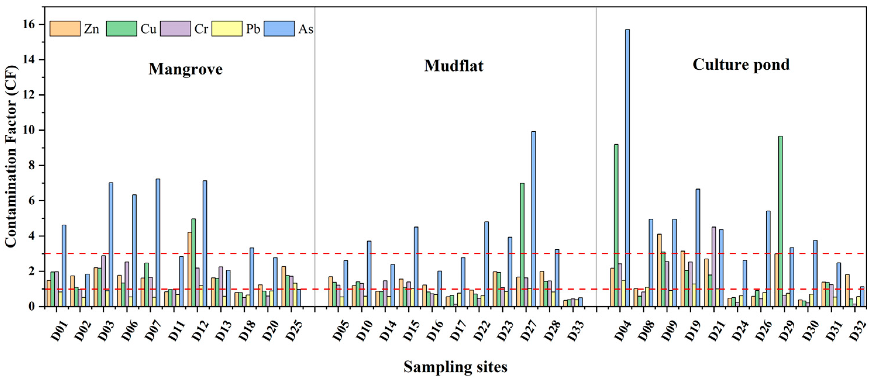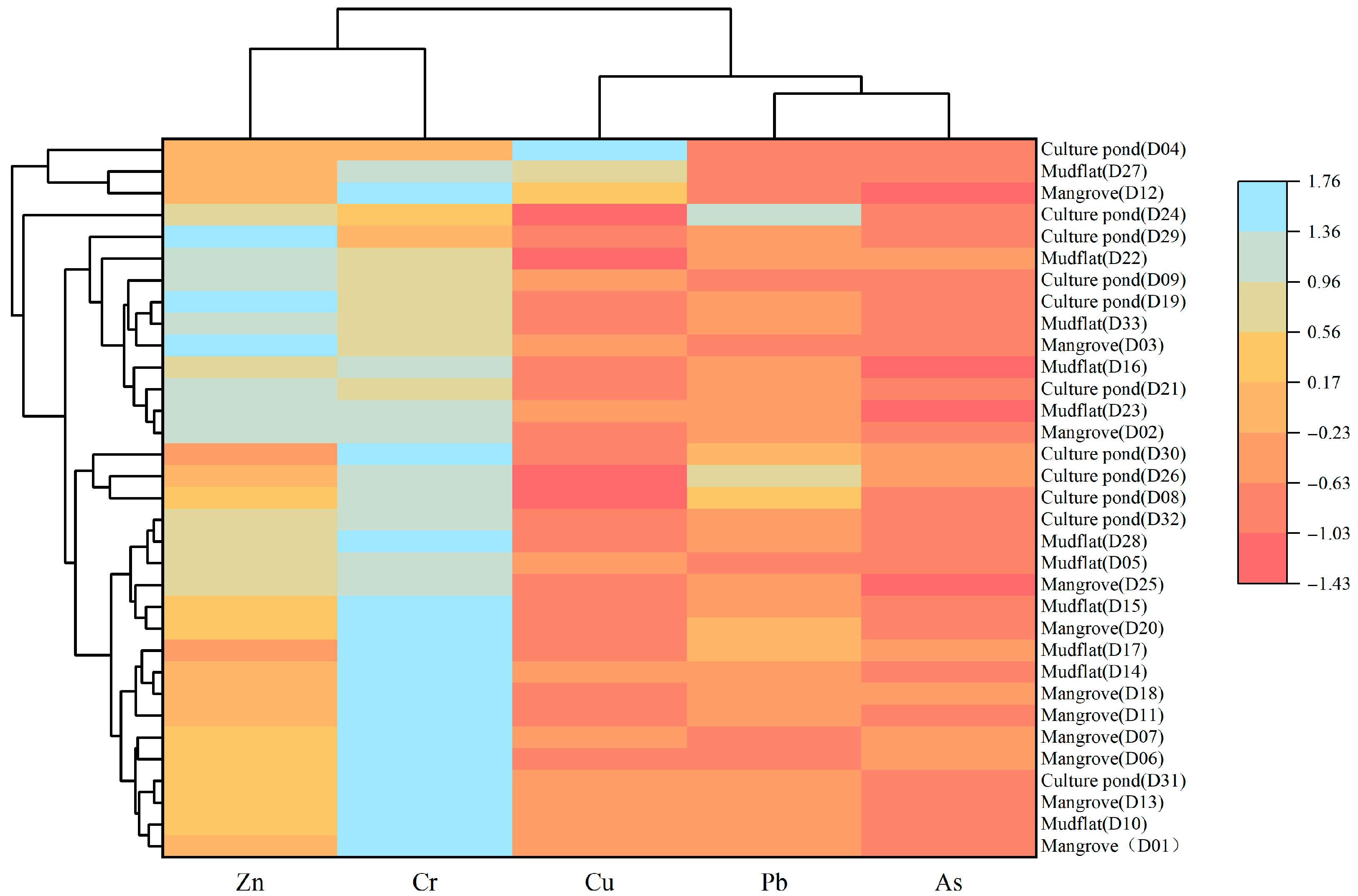 - Tang, D.; Luo, S.; Deng, S.; Huang, R.; Chen, B.; Deng, Z. Heavy metal pollution status and deposition history of mangrove sediments in Zhanjiang Bay, China. Front. Mar. Sci. 2022, 9, 989584. [Google Scholar] [CrossRef]