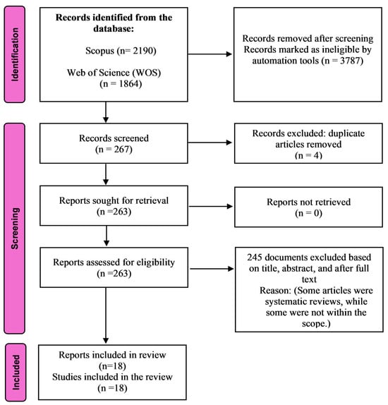 From Figure 1, initially, 4054 documents were identified and screened using the built-in refinement filters on academic databases. After screening, 3787 ineligible documents were removed, leaving 267 papers extracted as RIS files from both databases (Scopus: 148; Web of Science: 119). These 267 documents were uploaded to the Rayyan software (Rayyan 2.0) for detailed screening. This process involved removing four duplicates, screening 263 documents for inclusion and exclusion criteria, and conducting full-text reviews of the remaining documents. Two independent reviewers carefully examined the abstracts and full texts of the papers to ensure thorough assessment. Of these, 245 articles were excluded because they were reviews, fell outside the study’s scope, or were conference proceedings. This process resulted in a final sample selection of 18 documents for index analysis. The 18 eligible articles were extracted from the Rayyan software as CSV files. By using the PRISMA 2020 protocol [37] (Supplementary Materials) and the Rayyan software for a dual, independent, and blinded screening of abstracts and full texts, the review ensures transparency and justifiable inclusion/exclusion decisions. Furthermore, this meticulous process underscores our commitment to upholding high research standards and ensuring the relevance of our findings. The relatively small final sample is acknowledged as a limitation, resulting from the strict inclusion criteria and the scarcity of empirical studies focused on sustainability. Nevertheless, the selected studies provide high-quality empirical evidence that aligns with the review objectives.
