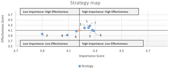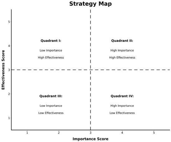 The model is divided into four quadrants based on their importance and effectiveness levels. The axis is determined by importance and effectiveness values, which divide the graph into four quadrants: high importance-high effectiveness, low importance-high effectiveness, high importance-low effectiveness, and low importance-low effectiveness. To determine the threshold values for all importance and effectiveness, this study uses the mean, the overall average score, as it better differentiates between high- and low-performing strategies in the collected data. Importance measures how necessary it is to have this strategy in place, and effectiveness assesses the extent to which it will solve the issue. Figure 2 shows how these strategies are sorted.