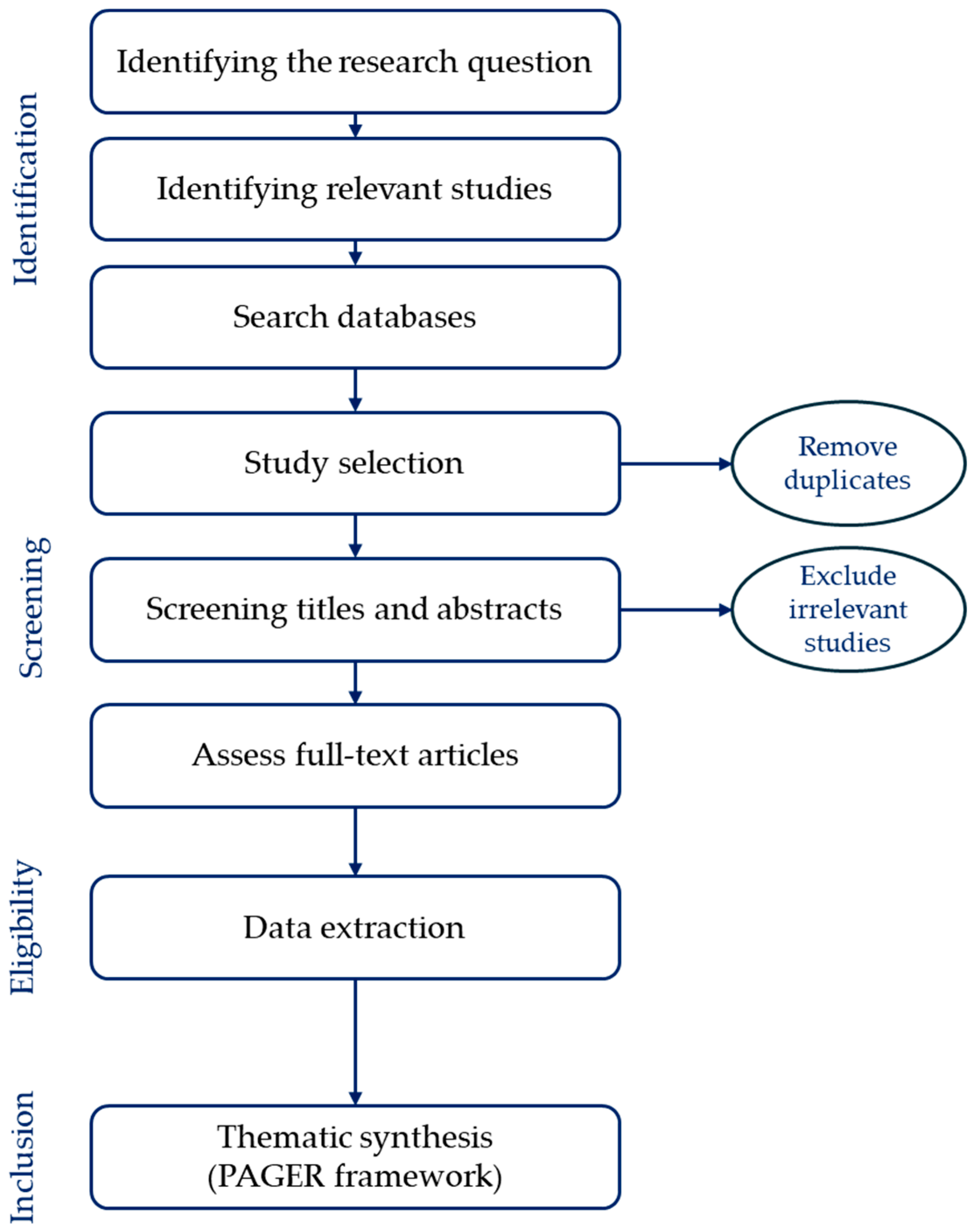 - Bradbury-Jones, C.; Aveyard, H.; Herber, O.R.; Isham, L.; Taylor, J.; O’Malley, L. Scoping reviews: The PAGER framework for improving the quality of reporting. Int. J. Soc. Res. Methodol. 2022, 25, 457–470. [Google Scholar] [CrossRef]