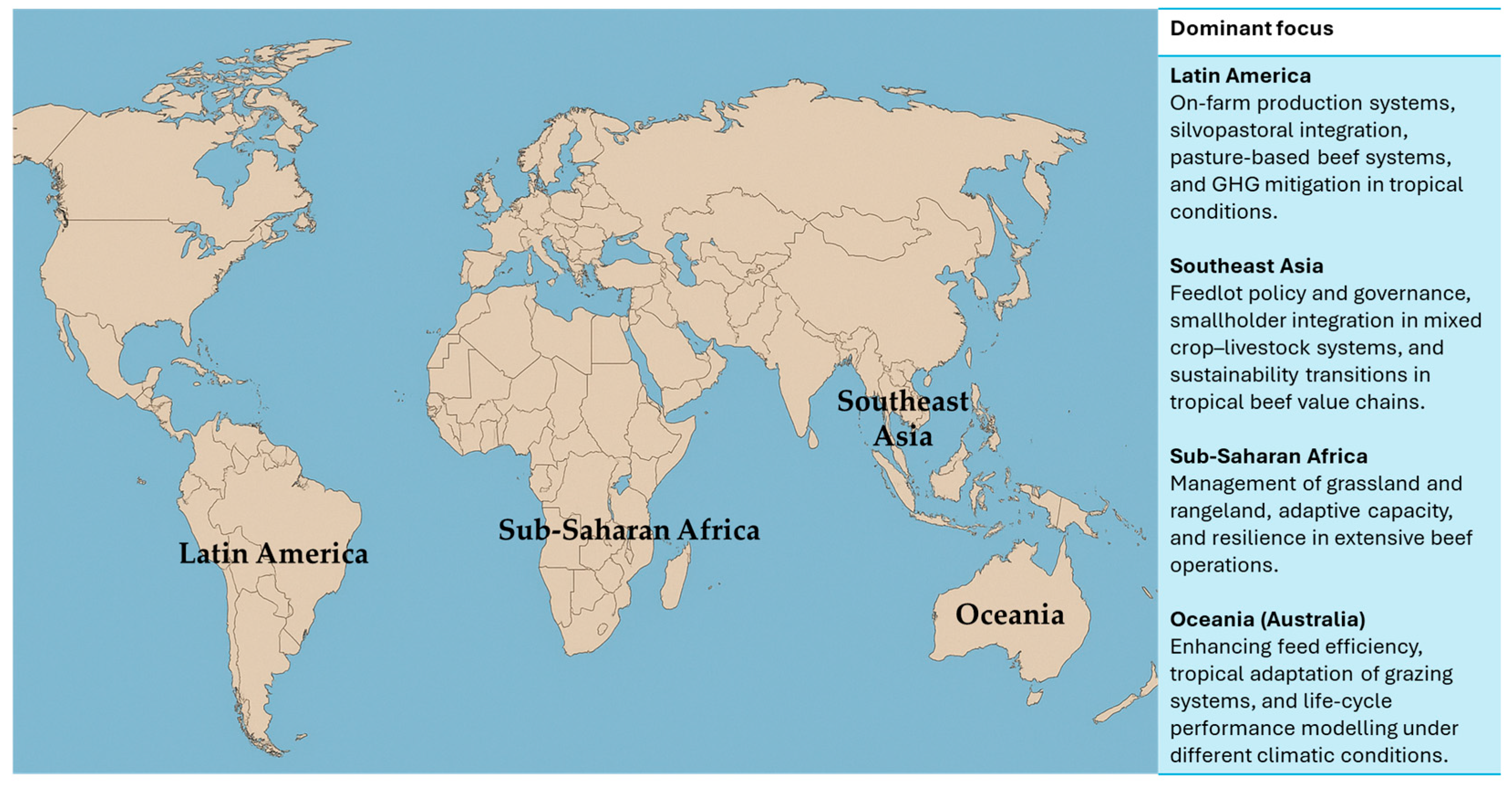 | Latin America (Brazil, Colombia, Mexico, Paraguay, and Argentina) | 28 | 3 | On-farm production systems, silvopastoral integration, pasture-based beef systems, and GHG mitigation in tropical conditions. |