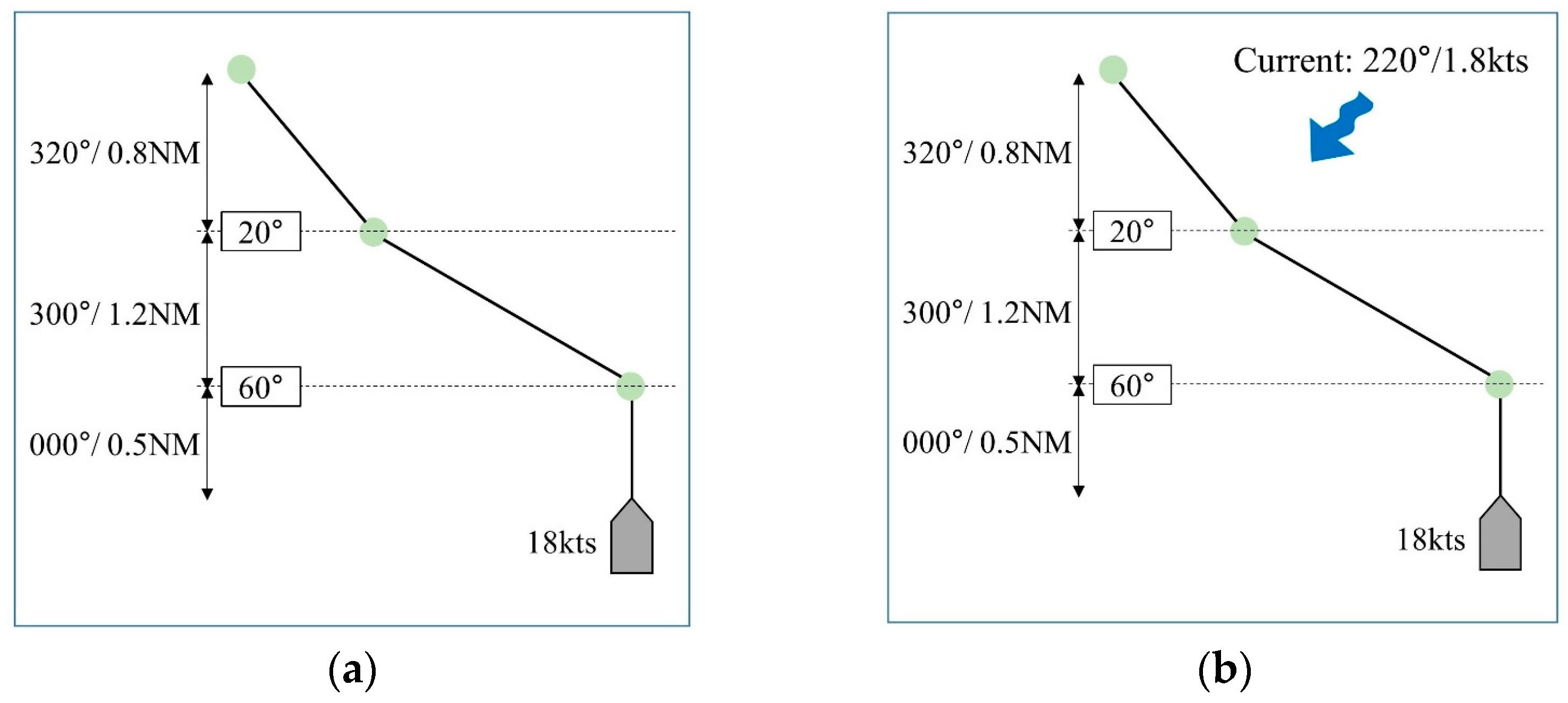 The simulation scenarios were designed with a total distance of 2.5 nautical miles, including three straight segments and two altering points, as shown in