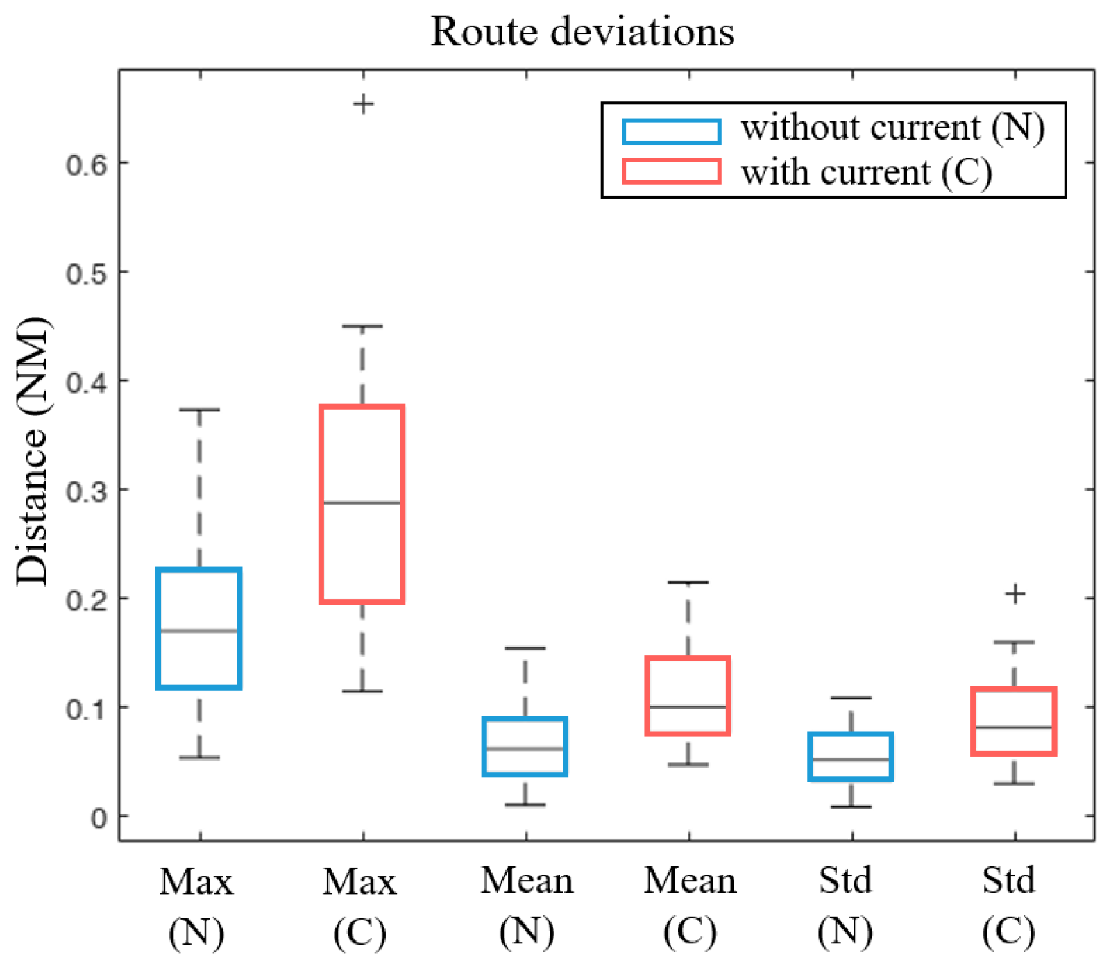 Figure 6 depicts the ship track results of participants under different conditions with and without currents. When tidal currents were absent, the trajectories were closely centered around the planned route, with minimal deviation. In contrast, when currents were present, the track width increased significantly, showing S-shaped trajectories. Participants found maneuvering the ship more challenging when experiencing the unexpected effects of currents. Notably, participants who demonstrated difficulty in responding effectively to the tidal current, particularly during the initial alteration segment, showed significant divergences from the intended route, resulting in pronounced S-shaped trajectories. The experimental results underscore the necessity of accurately perceiving the ship’s steering performance and the direction and intensity of the tidal current to effectively respond to tidal currents. Despite the inherent limitations of a simulator-based proxy setting (e.g., the absence of operational MASS constraints and broader current scenarios), a key strength of the proposed approach lies in its ability to isolate and consistently compare operator steering responses to tidal current effects under identical and repeatable conditions.