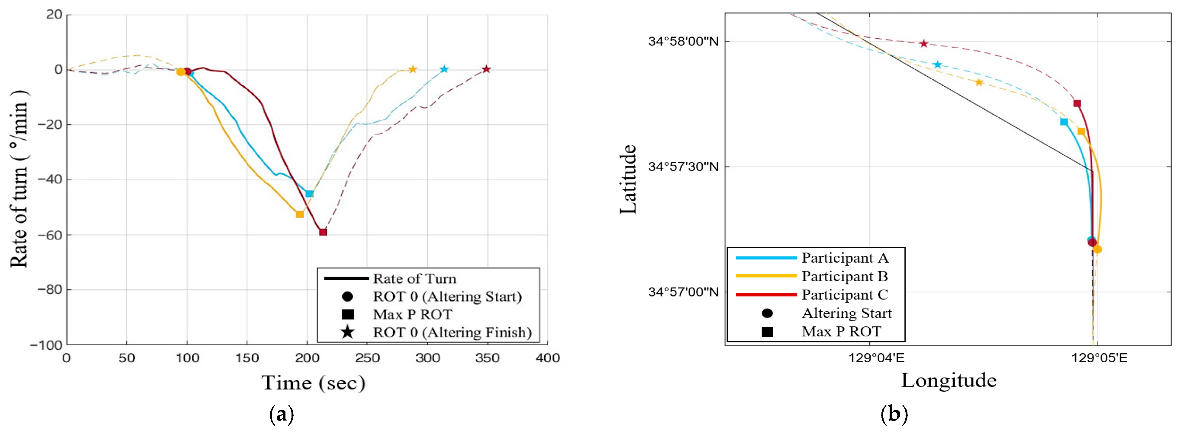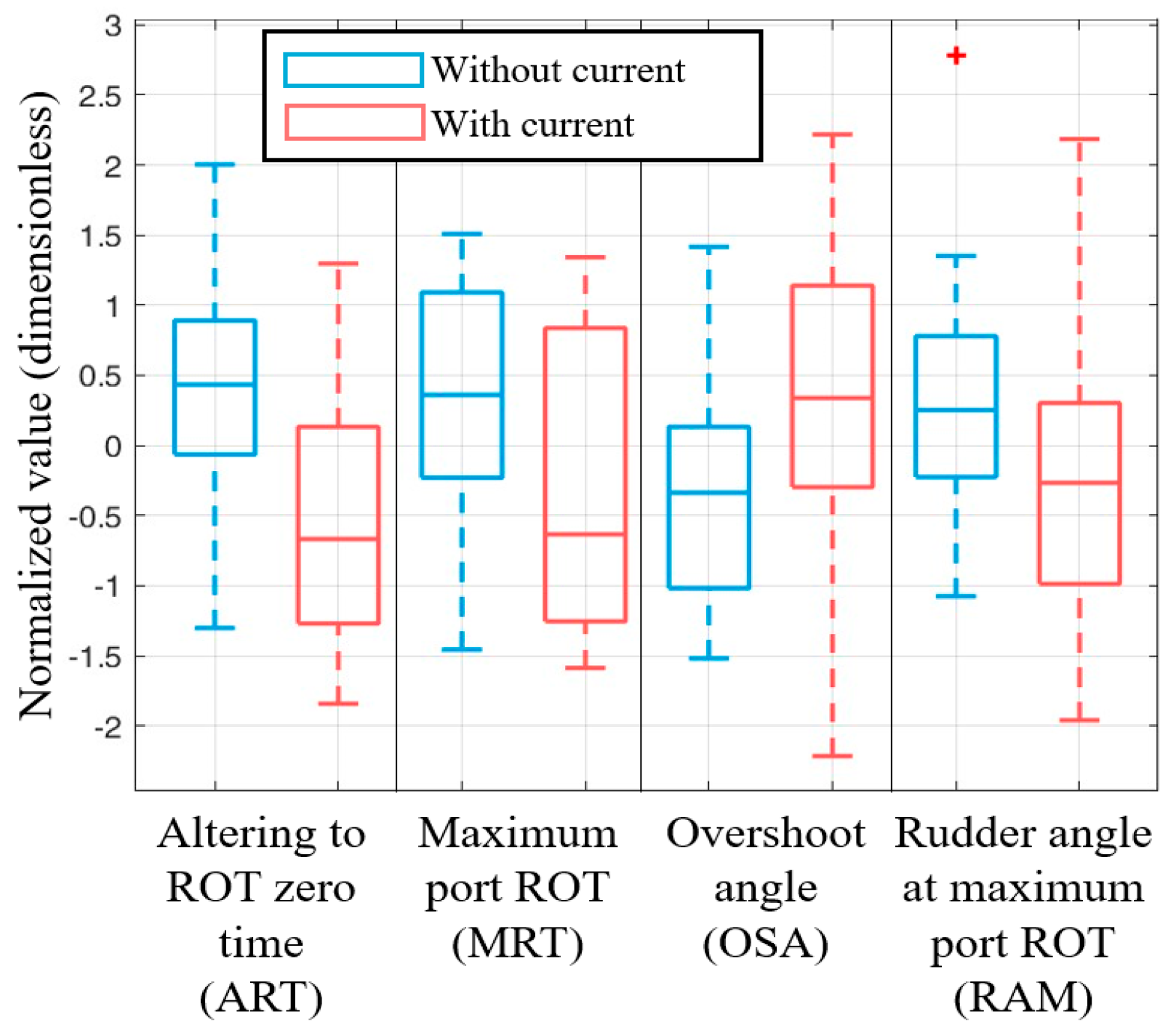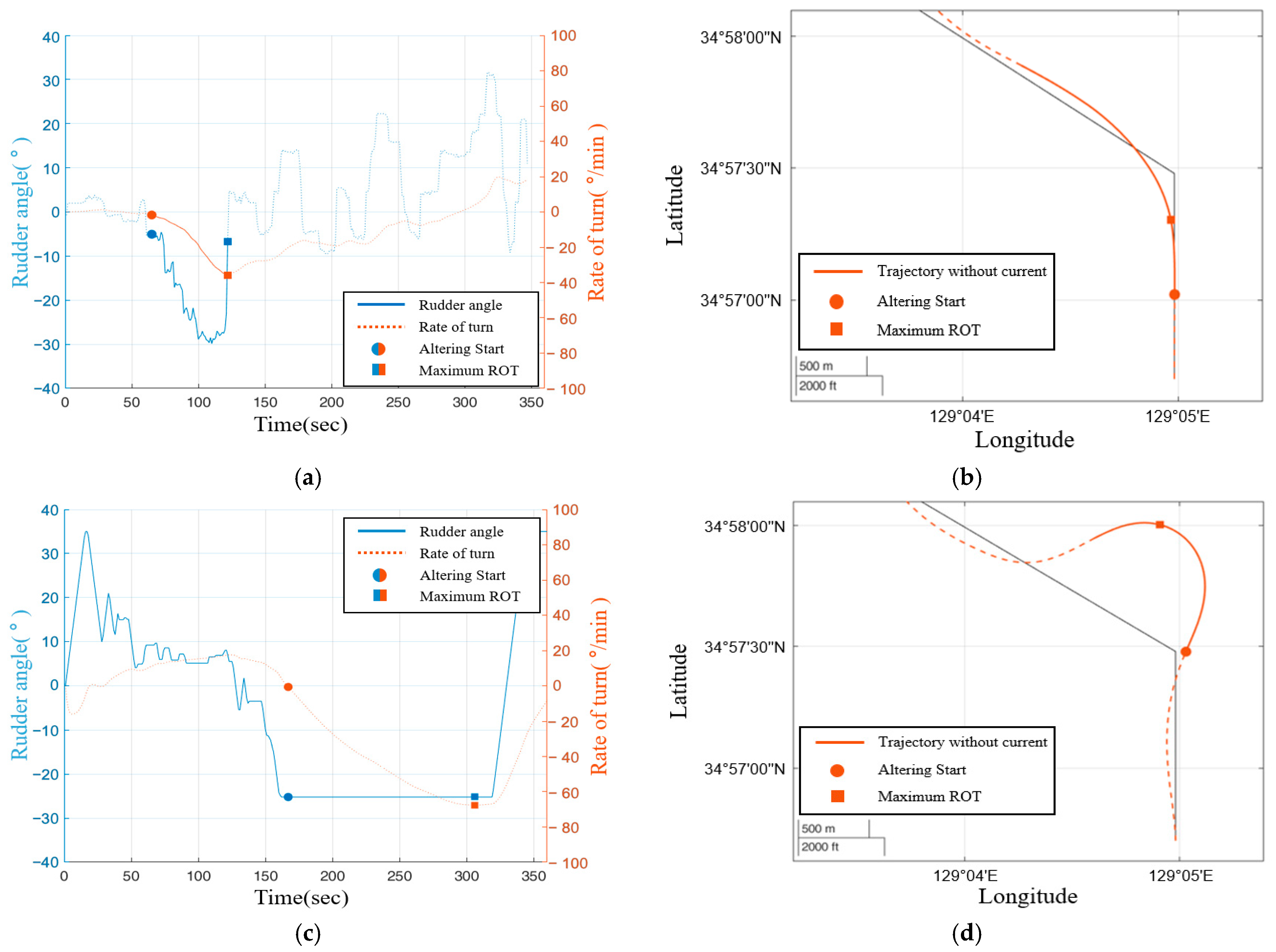 MRT is the maximum value of the ROT reached by the ship after the commencement of a turn. When turning performance is affected by tidal currents, especially environmental features such as tidal currents, MRT demonstrates how rapidly the ship’s heading is turning. ART and MRT represent crucial criteria for evaluating the extent to which an RO is effectively controlling the ship’s heading in the presence of tidal currents.