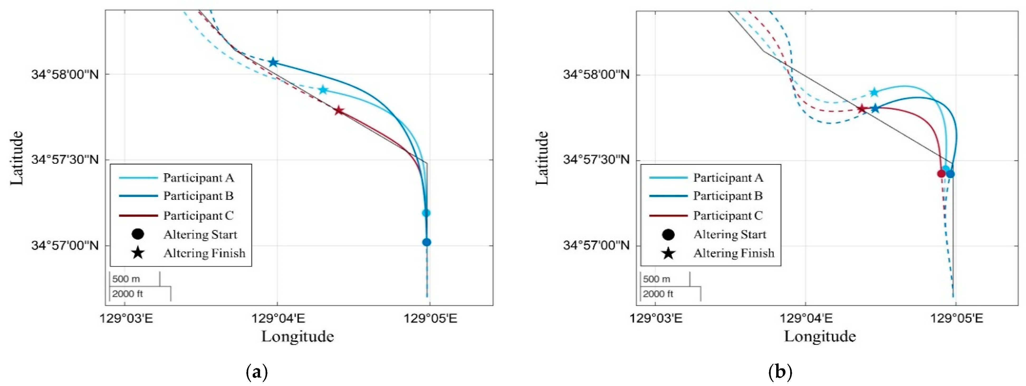 Figure 5. The distance to the first altering point was 0.5 nautical miles, to the second altering point it was 1.2 nautical miles, and from second point to the end of the planned route it was 0.8 nautical miles. The altering angles were set based on the difficulty level of the simulation scenarios [
