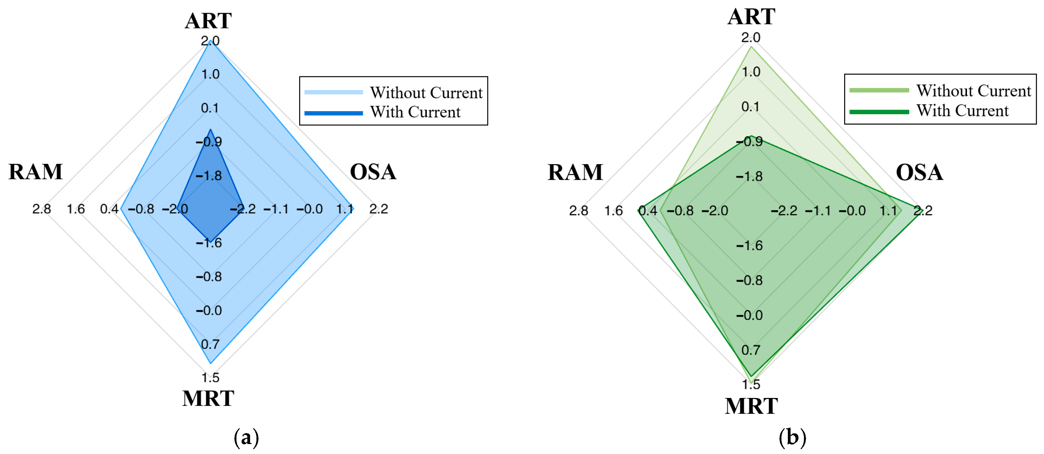 Figure 14a,b illustrate how each feature differentiates steering competence in the presence and absence of tidal currents. In the spider plots, ART and MRT in the acceleration domain, which face each other, evaluate responses to tidal currents during turning, while OSA and RAM in deceleration evaluate rudder adjustments for decelerating turns. Features positioned closer to the center indicate a lower ability to steer effectively in response to tidal currents.